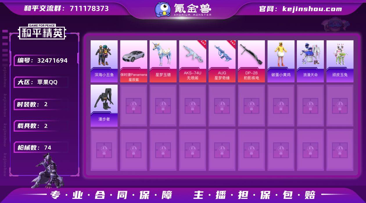 DSH2405【AUG-星梦奇缘[5级]2载具-2粉装-5特效 深海小丑鱼,浪漫天命】苹果手Q-2载具-2粉装-5特效枪-47套装-74枪皮-2王牌印记-荣耀皇冠Ⅴ-25729热力值 【2载具】星梦玉骢,保时捷Panamera(星辰紫) 【2粉装】角色-罪夜之冕,角色-花灵 【5特效枪】AUG-星梦奇缘[5级],Mk14-福马献瑞[4级],M249-绝对恒星[4级],AKS-74U-无垠阁[3级],DP-28-豹影疾电[5级] 【3稀有】深海小丑鱼,浪漫天命,S686-奇异狩猎者 【6飞行器】炫彩糖果飞行器,鸡智如我飞行器,狂鲨锋刃飞行器,马上有福飞行器,登顶巅峰飞行器,光之冒险尾迹 【111其它衣服和枪皮】朱霞炽焰,画境星梦,顽皮橙,SS34特训,红釉青花,萌鸡速递,风迹短诗,SS35特训,马上有钱,狂鲨锋刃,书海巡游,破蛋小黄鸡,完美偶像,粉黛兰香,角色-极地流光,角色-粉雾星云,午间小调,擎苍青焰,海岛探路者,角色-孙斩天,莱茵河畔,角色-绯色魅影,炫彩糖果,SS36特训,超能元气,顽皮玉兔,凌霄紫焰,琴音绮想,角色-超感刻度,角色-拉面少女,SS37特训,猛禽,阳光菠萝,雪国风尚,玩偶服-美羊羊,狙击之神,王牌教练,元气之梦,长空猛禽,雨过天青,漫步者,青翼流星,秘语星愿,ACE32-画境星梦,GROZA-拉面少女,DBS-风迹短诗,燃烧瓶-福马献瑞,SCAR-L-彩虹符号,战术弩-极夜星羊,M762-天...