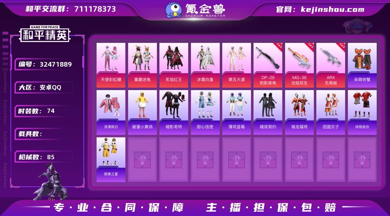 WJ839【素材号7粉装-3特效枪 天使彩虹糖 暗影哥特 羊梦糖心 第五大道 小熊背包】安卓手Q-7粉装-3特效枪-74套装-85枪皮-1王牌印记-坚韧铂金Ⅱ-27066热力值 【7粉装】童趣迷兔,冰霜白皇,角色-羊梦糖心,第五大道,炙焰红王,天使彩虹糖,角色-花灵 【3特效枪】ARX-无垠阁[4级],MG-36-沧焰双生[4级],DP-28-豹影疾电[5级] 【2稀有】暗影哥特,AKM-缤纷海域 【2飞行器】红色滑翔尾迹,鸡智如我飞行器 【1头盔】童趣迷兔头盔 【1背包】萌熊伴侣背包 【147其它衣服和枪皮】竞技名士,完美偶像,午间小调,SS15特训,擎苍青焰,游乐,SS18特训,甜心信使,都市魅力,白色伏地魔,SS16特训,绯格组合,团圆交子,风迹短诗,玩偶服-喜羊羊,SS35特训,萌黄之夏,破蛋小黄鸡,薄荷星砂,暴风机械师,暗夜契约,青春冒险家,玩偶服-懒羊羊,云魄琉璃,冷焰舞者,SS36特训,怒火燎原,魅力单车,西部风情,SS14特训,福星高照,漫游都市,黑色伏地魔,柠萌假日,朱霞炽焰,幻影武者,蓝彩潮人,萌鸡速递,青涩时光,都市漫游者,潮流游乐家,牛气满满,SS37特训,角色-绯色魅影,SS34特训,SS17特训,海岛探路者,绮丽涂鸦,元素星魂,狙击之神,凌霄紫焰,黄色运动,猛禽,空投萌叽,角色-夜瞳黯灵,恋恋初桃,元气之梦,薄荷蓝莓,浪漫假日,瑞龙福将,彩虹骑...