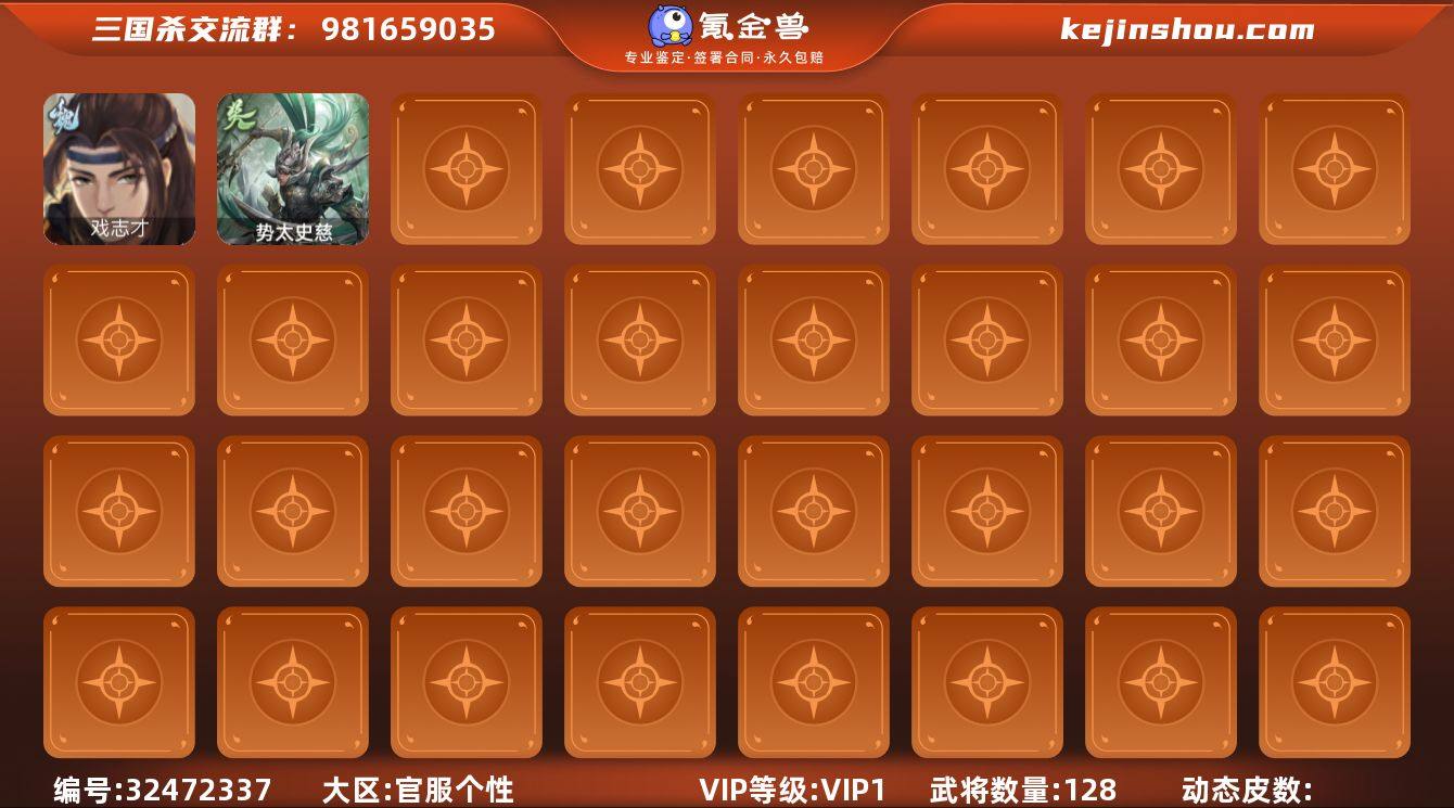 【2515】官阶:先锋将军;VIP等级:VIP1;史诗武将数量:2;动态皮肤数量:0;武将总数:128;史诗宝珠数量:0;将魂数量:4751;神将:0;魏国史诗武将:0;蜀国史诗武将:0;吴国史诗武将:1;群史诗武将:0 戏志才,势太史慈