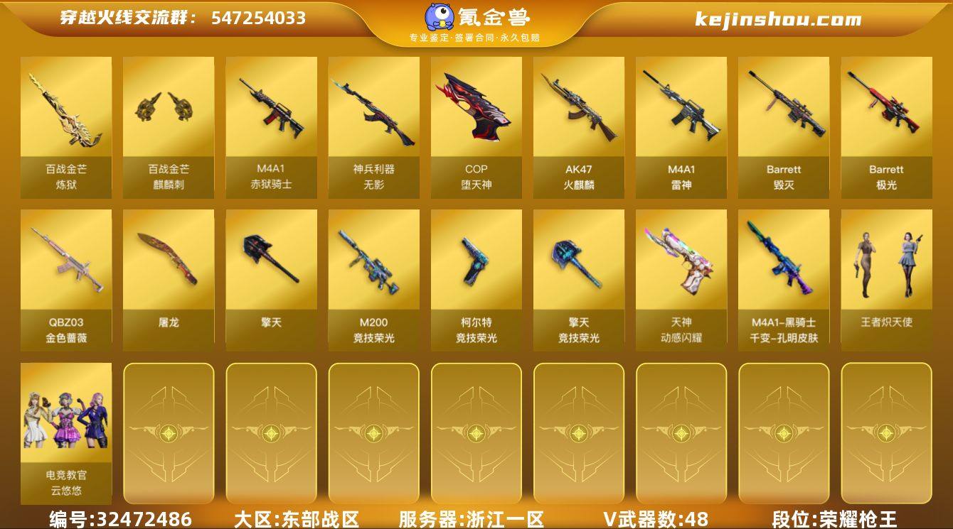 浙江一区-51V-0王者-0炫金 【热门武器】:QBZ03-金色蔷薇,M200-竞技荣光,COP-堕天神 【音效卡】:炼狱-百战金芒-庆典舞曲音效卡 【皮肤】:M4A1-再燃火线,M4A1-千变-孔明皮肤,轻型军用手斧-再燃火线 【角色】:电竞教官-云悠悠,王者炽天使,乔伊教练,修道士,云海玲珑,初恋灵狐,电竞少女,芳心审判者,风暴女,嘉年华灵狐,0号玩家,灵狐者-X,曼陀罗-礼服,潘多拉-X,潘多拉-甜心教官,铁骑荣耀,兔囡囡 【人偶武器】:AWM-灵狐-15周年嘉年华,迷你牛魔王,深渊终结者手雷 【暴走生化】:双面神 【挑战大师】:冰龙粉碎者-白马银枪,激光毁灭者III,神圣爆裂者-末日III 【英雄级武器】:AK47-火麒麟,M4A1-雷神,无影-神兵利器,QBZ03-金色蔷薇,Barrett-毁灭,Barrett-极光,M200-竞技荣光,炼狱-百战金芒,COP-堕天神,柯尔特-竞技荣光,天神-动感闪耀,屠龙,擎天,擎天-竞技荣光*5,麒麟刺-百战金芒,高爆手雷-竞技荣光*8,手雷-动感闪耀,闪光弹-竞技荣光*10,烟雾弹-竞技荣光*9,M4A1-赤狱骑士 【道具】:CFS限定背包,百战金芒炫彩背包,虎牙炫彩背包,救世主-黑桃战神,绿色巨人,灵魂忍者,变异宝贝,迷雾幽灵*2,生化弹匣,夺命之镰,防化服*2,金色流光-...