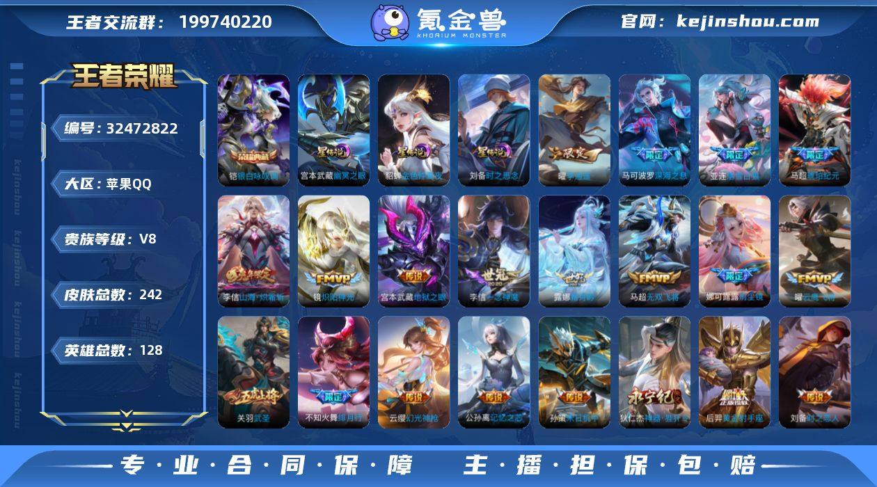 战马超·金标梦奇·铠银白咏叹调·金色貂蝉·澜愿照九州拓·落雪白狼·马超琥珀纪元·霜月吟·记忆之芯·山海炽霜斩·神器狴犴令·可二次】w19101-苹果Q-128英雄-242皮肤-17王者印记-200铭文-贵族积分8w【贵族8】【1典藏·3星传说·30传说·1天幕·14按键】【因赛季更新游戏段付以上号为准!】 【英雄全皮】:孙权全皮,娜可露露全皮 【荣耀典藏】:铠银白咏叹调 【星元皮肤】:貂蝉金色仲夏夜,宫本武藏幽冥之眼,刘备时之思念 【天幕】:共赏芳华天幕 【传说皮肤】:后羿神树通天,澜愿照九州拓,云缨幻光神枪,亚连落雪白狼,马超琥珀纪元,露娜霜月吟,公孙离记忆之芯,李信山海炽霜斩,吕布怒海麟威,狄仁杰神器狴犴令,不知火舞绯月行,娜可露露前尘镜,马可波罗深海之息,马超无双飞将,孙策挚爱之约,孙策末日机甲,裴擒虎寅虎赤拳,赵云淬星耀世,曜李逍遥 ,周瑜音你心动,镜炽阳神光,虞姬启明星使,关羽武圣,曜云鹰飞将,李信一念神魔,刘备时之恋人,梦奇胖达荣荣,后羿黄金射手座,宫本武藏地狱之眼,狄仁杰超时空战士 【限定皮肤】:狄仁杰阴阳师,廉颇寅虎御盾,赵云皇家上将,墨子神迹守卫,嬴政优雅恋人,庄周高山流水,元歌云间偶戏,元歌无心,马可波罗暗影游猎,马可波...