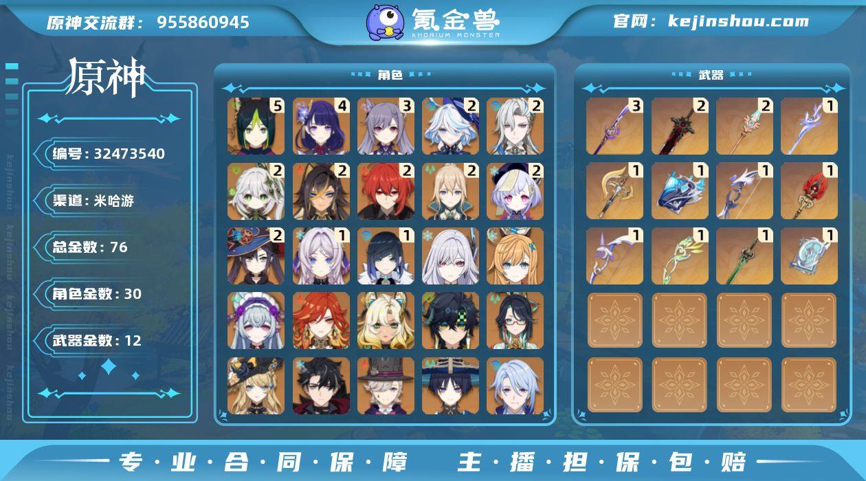 邮箱: 未绑定 总黄数: 76 冒险等级: 60 5命金色角色: 五命提纳里 4命金色角色: 四命雷电将军 3命金色角色: 三命刻晴 2命金色角色: 二命迪卢克,二命七七,二命莫娜,二命琴,二命纳西妲,二命迪希雅,二命那维莱特,二命芙宁娜 1命金色角色: 一命夜兰,一命茜特菈莉 0命金色角色: 枫原万叶,钟离,魈,胡桃,八重神子,神里绫人,流浪者,林尼,莱欧斯利,娜维娅,闲云,基尼奇,希诺宁,玛薇卡,梦见月瑞希,爱可菲,丝柯克 拥有武器: 狼的末路,四风原典,阿莫斯之弓,天空之脊,磐岩结绿,护摩之杖,薙草之稻光,若水,猎人之径,万世流涌大典,裁断,苍耀 3精武器: 薙草之稻光 2精武器: 狼的末路,天空之脊 1精武器: 四风原典,阿莫斯之弓,磐岩结绿,护摩之杖,若水,猎人之径,万世流涌大典,裁断,苍耀 亮点: 【sy58】60级/76黄/女主/30个五星角色/12个五星武器0命闲云,0命娜维娅,2命芙宁娜,0命莱欧斯利,2命那维莱特,0命林尼,2命迪希雅,0命流浪者,2命纳西妲,5命提纳里,1命夜兰,0命神里绫人,0命八重神子,4命雷电将军,0命枫原万叶,0命钟离,0命胡桃,0命魈,3命刻晴,2命七七,2命琴,2命莫娜,2命迪卢克,0命基尼奇,0命希诺宁,0命玛薇卡,1命茜特菈莉,0命梦见月瑞希,0命爱可菲,0命丝柯克,精1裁断,精1万世流涌大典,精1猎人之径,...