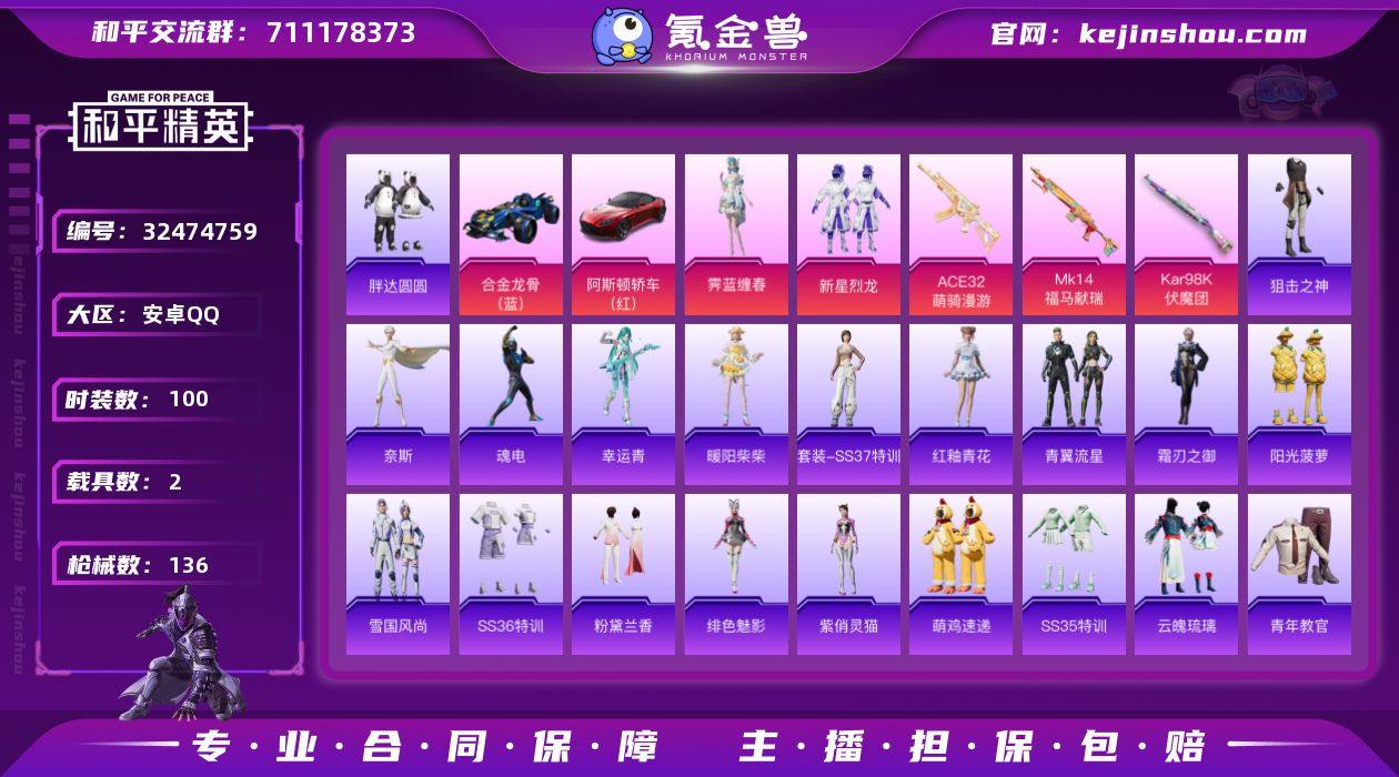 【2载具 3特效枪 2粉装 136枪皮 100套装】4王牌1卓越1传奇 热力值4.4w 合金龙骨(蓝),阿斯顿·马丁DBS(红) 胖达圆圆,新星烈龙,NV战队服,霁蓝缠春 ACE32-萌骑漫游,Kar98K-伏魔团,Mk14-福马献瑞 炫彩糖果飞行器,辉光之愿飞行器,登顶巅峰飞行器,伏魔团飞行器,编号:QNEZU63