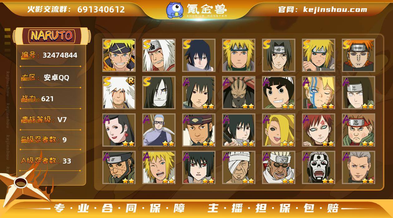 实名: 可修改 贵族等级: V7 S忍数: 9 A忍数: 33 战力值(万): 621 S级忍者: 波风水门「秽土转生」,佩恩「天道」,大蛇丸,波风水门,宇智波鼬 「须佐能乎」,自来也 「舞之豪杰」,宇智波佐助「永恒万花筒」,自来也 「传说中的三忍」,漩涡鸣人·宇智波佐助 热门A级忍者: 宇智波佐助「须佐能乎」,波风水门「新春限定」,桃地再不斩「秽土转生」