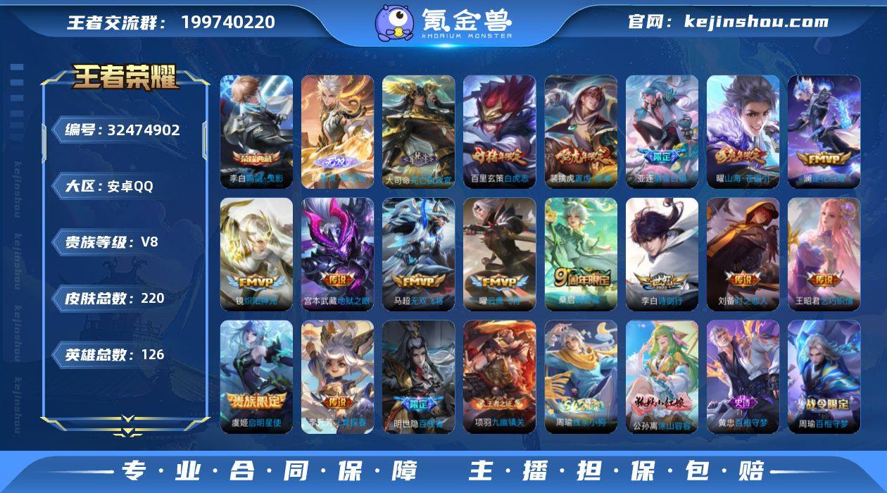 【307皮肤2典藏1无双1星传说 韩信典藏曜无双 愿照九州拓白虎志凤求凰至尊宝,精品打野 】:安卓Q-V8-最强王者段位-124英雄-307皮肤-2典藏-1无双-1珍品传说-24传说-75史诗 【荣耀典藏】:武则天英雄,韩信弑枪猎影 【无双皮肤】:曜器灵螭龙剑 【珍品传说】:孙策时之奇旅 【内测皮肤】:高渐离玩趣恶龙,狂铁特工战影 【传说皮肤】:小乔音你心动,宫本武藏地狱之眼,狄仁杰超时空战士,武则天海洋之心,关羽武圣,貂蝉猫影幻舞,花木兰冠军飞将,后羿黄金射手座,虞姬启明星使,杨戬永曜之星,干将莫邪久胜战神,诸葛亮武陵仙君,百里玄策白虎志,李信一念神魔,李信山海炽霜斩,孙策末日机甲,马超无双飞将,曜云鹰飞将,桑启鸣野蒿,嬴政玄雷天君,云缨幻光神枪,虞姬愿照岁时盈,澜愿照九州拓 【限定皮肤】:白起狰,姜子牙天穹之誓,狄仁杰阴阳师,虞姬凯尔特女王,赵云皇家上将,墨子神迹守卫,嬴政白昼王子,庄周蜃楼王,高渐离死亡摇滚,高渐离玩趣恶龙,钟无艳王者之锤,钟无艳超时空战士,孙膑妖精王,扁鹊炼金王,芈月重明,吕布猎兽之王,周瑜赤莲之焰,元歌无心,夏侯惇朔风刀,甄姬游园惊梦,甄姬落雪兰心,曹操烛龙,典韦穷奇,马可波罗山海玄木吟,狄仁杰魔术师,狄仁杰万华元夜,达摩沙漠行僧,项羽海滩派对,老夫子醍醐杖,老夫子航海奇遇记,关羽冰锋战神,关羽武圣,程咬金演武夺筹,露娜一生所爱,韩信逐梦之影,兰陵王驯魔猎人,兰陵王金庭之子,花木兰青春决赛季,亚瑟狮心王,孙悟空至尊宝,孙悟空大圣娶亲,牛魔御旌,李元芳云中旅人,虞姬启明星使,钟馗驱傩正仪,杨玉环遇见飞天,杨戬永曜之星,哪吒逐梦之翼,雅典娜黎明之约,太乙真人饕餮,太乙真人华丽摇滚,鬼谷子原初探秘者,鬼谷子五谷丰年,诸葛亮武陵仙君,苏烈千军破阵,百里玄策白虎志,百里玄策原初追逐者,弈星混沌棋,梦...