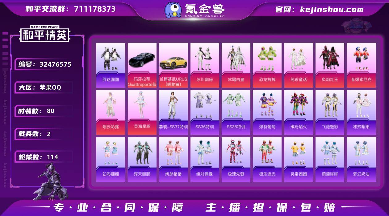 苹果 手Q-13粉装-2特效枪-1载具-54883热力值-2印记-163套装-148枪皮 【稀有载具】:双人摩托-梦幻火箭 【特效枪等级】:GROZA-旋转彩虹(五级),Vector-环太平洋(五级) 【优质套装】:粉装-宝贝奶油派,粉装-天使彩虹糖,粉装-梦幻火箭,粉装-炙焰红王,粉装-蜜桃特工,粉装-暗夜玫瑰,角色-复仇流浪者,粉装-暖熊萌萌,粉装-傲雪凌霜,粉装-霁雪冰心,粉装-暗夜鎏金,粉装-室女星神,角色-绯穹魔姬 【稀有套装】:套装-云朵鹅,套装-雪绒豹,角色-乐音,角色-黯羽织刑 【优质武器皮肤】:GROZA-旋转彩虹,Vector-环太平洋 【稀有武器皮肤】:AKM-彩虹符号,AKM-恐龙拽拽,AKM-环太平洋,AKM-虎虎生威,AKM-霓虹街区,AKM-龙的传人,M16A4-凝视深渊,M16A4-幻世战舞者,M16A4-甜心亚梦,M16A4-生命誓言,SCAR-L-暗夜玫瑰,SCAR-L-炫彩节奏,SCAR-L-玉兔迎春,SCAR-L-生命誓言,SCAR-L-银碳小老虎,M416-神秘黑猫,M416-糯团青竹,M416-红色方程式,M416-蓝色火焰,GROZA-异彩先驱,GROZA-彩虹符号,GROZA-影袭,GROZA-春暖花开,GROZA-田园牧歌,GROZA-蓝莓炮弹,AUG-耀粉歌者,QBZ-未来歌姬,QBZ-飞驰魅影,M762-天降萌叽,M762-暖熊萌萌,M762-瑞龙福将,M762-甜心宝贝,M762-绒雪飘舞,M762-云朵鹅,Mk47-林间仙鹿,Mk47-洛神天依,G36C-暗夜玫瑰,AC-VAL-天降萌叽,AC-VAL-甜心亚梦,蜜獾-垂柳戏鸭,蜜獾-天降萌叽,蜜獾-娇憨猪猪,UZI-天降萌叽,UZI-娇憨猪猪,UZI-炫彩节奏,UMP45-时空追击者,UMP45-涂山之恋,UMP45-生命誓言,UMP45-蓝色火焰,UMP45-圣穹绘梦,Vector-暗夜玫瑰,Vector-生命誓言,Vector-田园牧歌,汤姆逊-天降萌叽,汤姆逊-异彩先驱,汤姆逊-炫彩节奏,汤姆逊-环太平洋,汤姆逊-耀粉歌者,野牛-青春冒险家,MP5K-异彩先驱,P90-闪光银龙,P90-飞驰魅影,Kar98K-彩虹符号,Kar98K-梦幻火箭...
