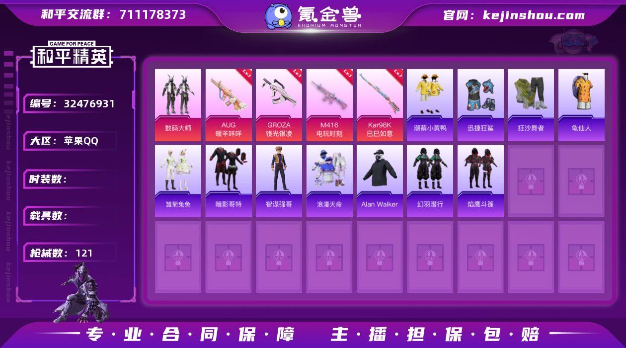 XS11450有二次【1粉装-5特效枪-AUG-暖羊咩咩[5级 暗影哥特 蓝螳螂】苹果手Q-1粉装-5特效枪-93套装-121枪皮-3王牌印记-坚韧铂金Ⅴ-33916热力值【1粉装】数码大师【5特效枪】Kar98K-巳巳如意[5级],DP-28-豹影疾电[1级],GROZA-镜光银凌[5级],AUG-暖羊咩咩[5级],M416-电玩时刻[5级]【4稀有】暗影哥特,狂沙舞者,TT战队服,浪漫天命【2飞行器】顶峰精英尾迹,粉色滑翔尾迹【2背包】百万伏特背包,酷熊伴侣背包【204其它衣服和枪皮】猎鹰,破晓战魂,极速红龙,潮萌小黄鸭,SS28特训,燃烧卡路里,花园小羊咩,空岛之星,冰川特警,焰鹰斗篷,牛气冲天,森林游猎者,麻辣教官,冰河战士,角色-都市丽猫,夏日倾情,SS36特训,雪国风尚,黄色伏地魔,魅力单车,元素星魂,雏菊兔兔,酒红色名流,迅捷狂鲨,星途旅人,绮丽涂鸦,青团波波,鱼渊荷华,猛禽,绯格组合,湖畔霞光,雨林探路者,龟仙人,SS25特训,幻羽潜行,燕燕于飞,香桃花海,角色-湖雨初晴,锦衣飞扬,大橘大利,恋语绒绒,SS21特训,红色运动,巳巳如意,角色-夜瞳黯灵,智谋强哥,SS33特训,黄色运动,龙魂突击队,动感兔斯基人偶服,缤纷果语,角色-Mark.06,海盐绵绵冰,蝶变,SS30特训,黑色伏地魔,SS31特训,Alan Walker,纯真浪花,萝兰蝴蝶,特殊使命,战术大师,春光漫游,甜蜜熊...
