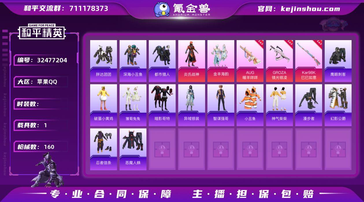 【1载具】保时捷918 Spyder(液态银)【6粉装】角色-猩猩队长,金丰海韵,炎氏战神,角色-异瞳寒姬,角色-阿尔茜,幻影战神【6特效枪】DP-28-豹影疾电[5级],AUG-暖羊咩咩[5级],GROZA-镜光银凌[5级],Mk14-福马献瑞[5级],Kar98K-巳巳如意[5级],ACE32-萌骑漫游[5级]【6稀有】小丑鱼,忍者信条,暗影哥特,胖达团团,深海小丑鱼,都市猎人【9飞行器】光之冒险尾迹,鸡智如我飞行器,异域银装飞行器,炫彩糖果飞行器,炎氏战神飞行翼,马上有福飞行器,登顶巅峰飞行器,提桶跑路飞行器,狂鲨锋刃飞行器【3头盔】幻影战神头盔,银河战甲头盔,深海小丑鱼头盔【2背包】幻影战神背包,深海小丑鱼背包【252其它衣服和枪皮】黑色伏地魔,街舞达人,缤纷果语,街头风暴,狂鲨锋刃,薄荷星砂,青翼流星,狙击之神,小熊娃娃,湖蓝色名流,曼妙人鱼,SS28特训,海岛探路者,战术大师,SS37特训,街头潮人,角色-许七安,SS32特训,长空猛禽,龙的传人,SS35特训,魅力单车,画境星梦,幻影公爵,冰河战士,角色-Mark.06,红色运动,福马献瑞,角色-时希公主,SS29特训,王牌...