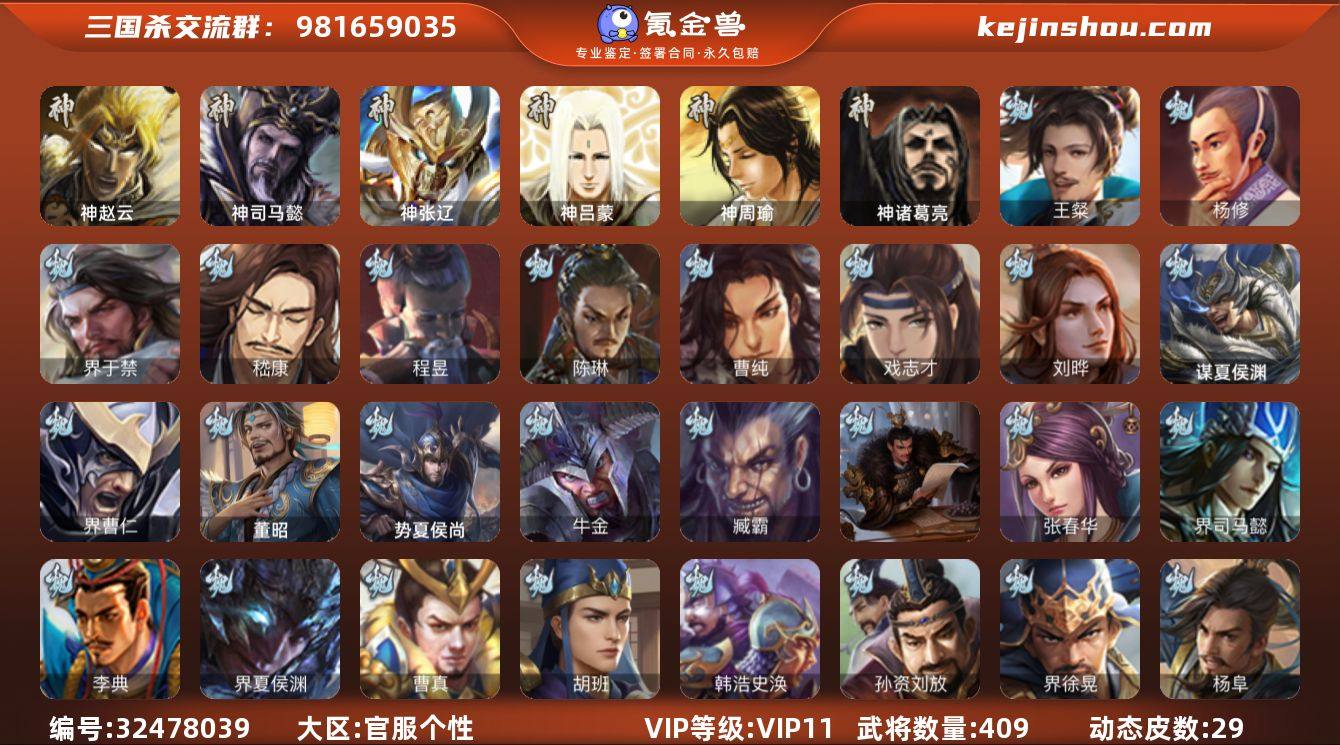 【14789654】官阶:大将军;VIP等级:VIP11;史诗武将数量:48;动态皮肤数量:29;武将总数:409;史诗宝珠数量:0;将魂数量:1665;神将:4;魏国史诗武将:23;蜀国史诗武将:10;吴国史诗武将:7;群史诗武将:19