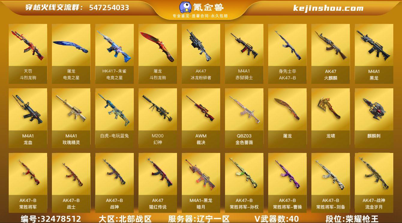 【自带包赔 最高三倍】:北部战区:辽宁一区-LV100-高阶大元帅-荣耀枪王-40V-0王者武器数-0炫金武器数 【热门武器】:QBZ03-金色蔷薇,M200-幻神,白虎-电玩蓝兔,金刚伞 【音效卡】:N9语音包 【皮肤】:幻神-电竞之星 皮肤,雷神-烈虎皮肤,雷神-宇航兔皮肤,雷神-神秘按键 皮肤,毁灭-黑曼巴 皮肤,黑龙-暗月,战神-粉色甜心皮肤,战神-紫绶金章皮肤,战神-流金岁月皮肤,AK47-B-常胜将军-曹操,AK47-B-常胜将军-刘备,AK47-B-常胜将军-孙权 【角色】:战地猎狐,乔伊教练,幻面灵狐,初恋灵狐,风暴女,娟娟,兰-新年限定,灵狐者-职业经理,麻雀,女战神,潘多拉-X,潘多拉-甜心教官,兔囡囡,职业选手 【人偶武器】:迷你深渊冰龙,迷你裂空之翼,深渊终结者手雷,闪光弹-貂蝉,高爆手雷-大乔 【挑战大师】:AK47-冰龙粉碎者,封神放逐者III 【英雄级武器】:AK47-火麒麟,M4A1-黑龙,M4A1-雷神*2,M4A1-龙血,M4A1-玫瑰精灵,QBZ03-金色蔷薇,AK-47-猩红传说,AK47-B-战神,AK47-B-常胜将军,白虎-电玩蓝兔,HK417-朱雀-电竞之星,AK47-B-身先士卒,AK47-B-战士,天罚-斗烈龙驹,AWM-裁决,M200-幻神,沙鹰-天神*2,屠龙,龙啸,麒麟刺,屠龙-电竞之星,屠龙-斗...