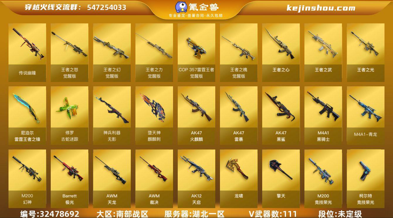 【自带包赔 最高三倍】:南部战区:湖北一区-LV102-高阶大元帅-未定级-111V-13王者武器数-8炫金武器数 【传说武器】:传说幽瞳 【热门武器】:传说幽瞳,QBZ03-金色蔷薇*2,M4A1-青龙,M200-幻神,修罗-古蛇迷踪,M200-竞技荣光,死亡之眼,M4A1-黑骑士,汤姆逊-烈龙*3,加特林-炼狱*5,斯泰尔-蝴蝶,USP-雷暴*2,COP 357-雷霆王者,沙鹰-修罗*3 【王者炫金武器】:王者之武,王者之心,王者之光,COP 357-雷霆王者,雷霆王者之锋,炫金骑士*2,炫金武士,炫金毁灭*2,炫金天龙*3 【音效卡】:天神-动感闪耀 音效卡,AK47-火麒麟音效卡,M4A1-雷神音效卡,Barrett-毁灭音效卡,Barrett-极光音效卡 【皮肤】:幻神-丹凤,幻神-青鹤,雷神-能量核心,雷神-冠军之魄,雷神-烈虎皮肤,毁灭-荣耀之怒,毁灭-星空,黑龙-能量核心,M4A1-黑龙-361,AK47-黑武士-361,天龙-秘银,AWM-天龙-传奇白鲨,极光-能量核心 【角色】:葵,炫,春,王者-魅影(四防),蛇隐宗,乔伊教练,风暴女,嘉年华灵狐,兰-海滩派对,零-水下丽影,灵狐者-X,龙儿,麻雀,蛇姬,铁骑荣耀,新娜塔莎,影武者-X 【人偶武器】:火麒麟-灵狐,斯泰尔-蝴蝶,Scar Light-马枪,AWM-灵狐-15周年嘉年华,迷...