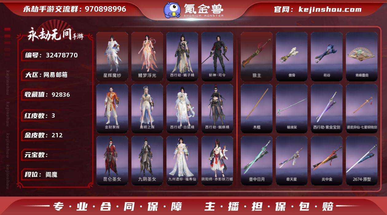 红皮数:3 金皮数:218 收藏值:94160 元宝数:31 幻丝数:458550 戎金狼,鲤梦浮光,沙漠香风 观山海·腓腓,P5R·奥村春 NOIR,观山海·夫诸,观山海·乘黄,绿野守护·纤羽翎风,流星群侠传·骆星尘,P5R·雨宫莲 JOKER,南山翠暖,怒浪,红川仙子,智绘·萍之缘,千秋匠心·青枝瓷,阴阳师·赤影妖刀姬,怪诞狂想·致命玩笑,银狼裘,冬日绮韵·白熊,云游者,龙之道·至纯,日轮之花,阴阳姬,御宅罗梦,赤翎之约,龙门·飞天,康复之星,龙之影·精武魂,流星群侠传·叶扬,西行劫·大力王,醉山川,狂虎,拳皇·八神庵,山风客,无间游戏·飞彪族,西行劫·悟空,2674·争斗洪流,八宝龙王,龙之影·过江龙 精武,衔谷,青峰叠扇,妒火,观山海·乘黄之风,输液架,花药棍,西行劫·紫金宝剑,含光承影,炎中金,烛神令,切影,金玉一文字,数珠丸,九难刀,龙蟠,千秋匠心·素瓷,2674·猎刃,化魄,判官笔,空寒,宗蓝,截魄,雪夜·清光引,丹鹤,腥红之月,朱雀,观山海·嘉果花,貔貅吞宝,造景,钻山,绿野守护·雨幕,戏祥云 卖家说:个人一手弃坑号,诚心出,支持官方换绑,安全无找回! 3红(特木尔+迦南+胡桃)216金皮(争斗洪流➕八神庵),衣柜深度足 历史最高罗刹一,当前荧星5,市/区排名称号齐全 高阶魂玉(极刃·近战),2265万枫叶,资源充足 手机可换绑,实名可清/可换 平台担保,资料齐全,换绑快,可小刀,屠龙刀勿扰。