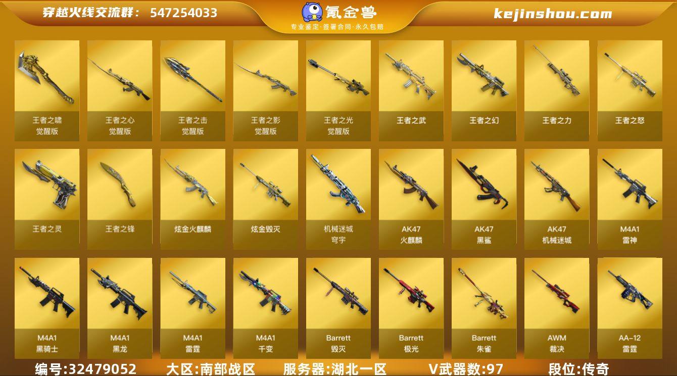 MCF680【南部湖北一区】【97V15王者7炫金 5盘龙+1炼狱 雷霆套 6修罗 6烈龙 死亡之眼 】【王者武器】 王者之心觉醒版 王者之影觉醒版 王者之光觉醒版 王者之啸觉醒版 王者之击觉醒版 王者之幻 王者之武 王者之力 王者之怒 x2 王者之灵 x3 王者之锋 x2 【炫金武器】 炫金火麒麟 炫金雷神x2 炫金骑士x3 炫金毁灭 【英雄武器】 M4A1-千变 AK47-火麒麟 M4A1-黑龙 M4A1-雷神 M4A1-黑骑士 AK12-天启 AK47-机械迷城 AK47-黑鲨 M4A1-雷霆 机械迷城-穹宇 9A-91-烈火 AK47-B-战神 Barrett-毁灭 Barrett-极光 Barrett-雷霆 Barrett-朱雀 AWM-裁决 RPK-盘龙 加特林-炼狱 汤姆逊-烈龙 AA-12-雷霆 沙鹰-修罗 沙鹰-天神 COP357-雷霆 屠龙 龙啸 擎天 麒麟刺 尼泊尔-雷霆 高爆手雷-雷霆x7 烟雾弹-雷霆x7 闪光弹-雷霆 x7 【角色】 葵 零 瞳 樱 炫 【音效卡】 Barrett-碧霄极光音效卡 Barrett-毁灭音效卡 【皮肤】 毁灭耀金皮肤 火麒麟-华夏之心 雷神-虎将 火麒麟-CF STAR 天龙-CF STAR 修罗-CF STAR