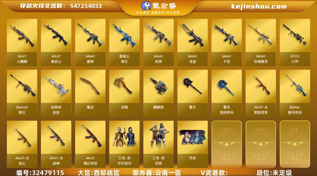 [17743862]8404/西部/云南一区/可排位/31v/幻神/玫瑰精灵/雷神/火麒麟/黑武士锦绣游龙/死神/黑骑士海王/王者之灵/觉醒版/【四防角色】/王者葵貂蝉/【角色】/葵/雨棠/【音效卡】/黑骑士音效卡/【枪皮】/毁灭暗月/修罗能量核心/火麒麟雷神/火麒麟心动糖果/【王者武器】/王者之击/永久AC/有过十年记录/找回包赔
