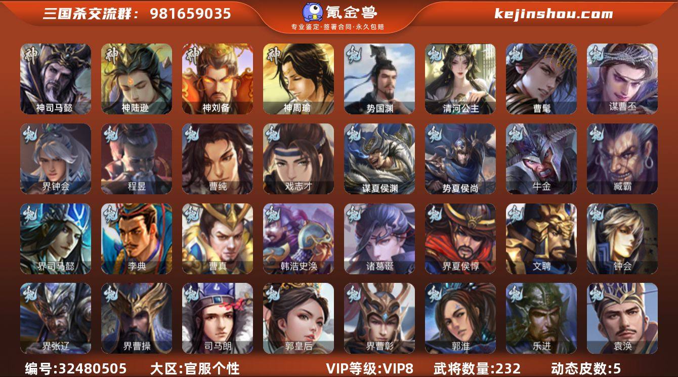 VIP等级: VIP9 官阶: 大将军 武将数量: 340 动态皮肤数量: 24 神将: 神吕布,神张辽,神赵云,神关羽,神吕蒙,神周瑜 魏国武将: 戏志才,曹纯,程昱,界于禁,界钟会,文鸯,张辽,SP蔡文姬,SP曹仁,SP关羽,SP贾诩,SP姜维,SP庞德,卞夫人,曹昂,曹操,曹冲,曹洪,曹丕,曹仁,曹叡,王异,张恭,鲁芝,界满宠,曹休,界曹植,满宠,荀攸,钟繇,郭嘉,牵招,荀彧,阮慧,杜畿,界郭嘉,崔琰,界曹丕,界荀彧,朱灵,辛毗,界陈群,界王异,界许褚,华歆,陈群,界曹休,袁涣,乐进,辛宪英,郭淮,毛玠,界曹彰,郭皇后,夏侯惇,曹植,司马朗,谋于禁,界曹操,许褚,界张辽,张郃,钟会,文聘,曹彰,界夏侯惇,诸葛诞,司马懿,甄姬,杨阜,界徐晃,徐晃,孙资刘放,韩浩史涣,胡班,曹真,典韦,夏侯渊,李典,于禁,王双,邓艾,界司马懿,张春华,臧霸,朱灵(国战),文钦-魏,董昭 蜀国武将: 董允,花鬘,沙摩柯,王平,赵襄,谋马超,谋赵云,徐庶,杨仪,吕凯,界关羽,界诸葛亮,邓芝,界伊籍,费祎,严颜,界张嶷,赵云,张松,彭羕,李丰,界刘备,谋姜维,刘封,糜竺,黄月英,关羽,王甫赵累,吴懿,界廖化,向宠,祝融,张飞,黄皓,魏延,马忠,界法正,糜夫人,界孟获,刘禅,界赵云,界姜维,张翼,关银屏,界祝融,SP孙尚香,SP徐庶,卧龙诸葛,周仓,简雍,界关兴张苞,诸葛亮,孙乾,界张飞,法正,赵统赵广,陈到,界马岱,关平,马岱,界庞统,庞统,诸葛果,谋张飞,马谡,马超,廖化,关兴张苞,孟获,夏侯氏,姜维,黄忠,刘备,界马超,李严,马良,傅肜,蒋琬费祎,许靖,刘谌,彭羕(国战),甘夫人,蜀-糜芳傅士仁,SP甘夫人 吴国武将: 界步练师,界徐盛,界朱然,留赞,孙皓,周处,文鸯,潘濬,周泰,全琮,吕蒙,诸葛恪,界孙尚香,大乔小乔,桥公,界程普,许贡,丁奉,谋吕蒙,孙茹,顾雍,阚泽,孙亮,界朱治,孙休,严畯,界孙权,界凌统,祖茂,濮阳兴,界虞翻,界吕蒙,孙登,界孙策,凌操,朱治,孙尚香,程普,大乔,韩当,陆逊,诸葛瑾,朱然,吕范,太史慈,虞翻,界黄盖,孙鲁班,界周瑜,界潘璋马忠,卫...