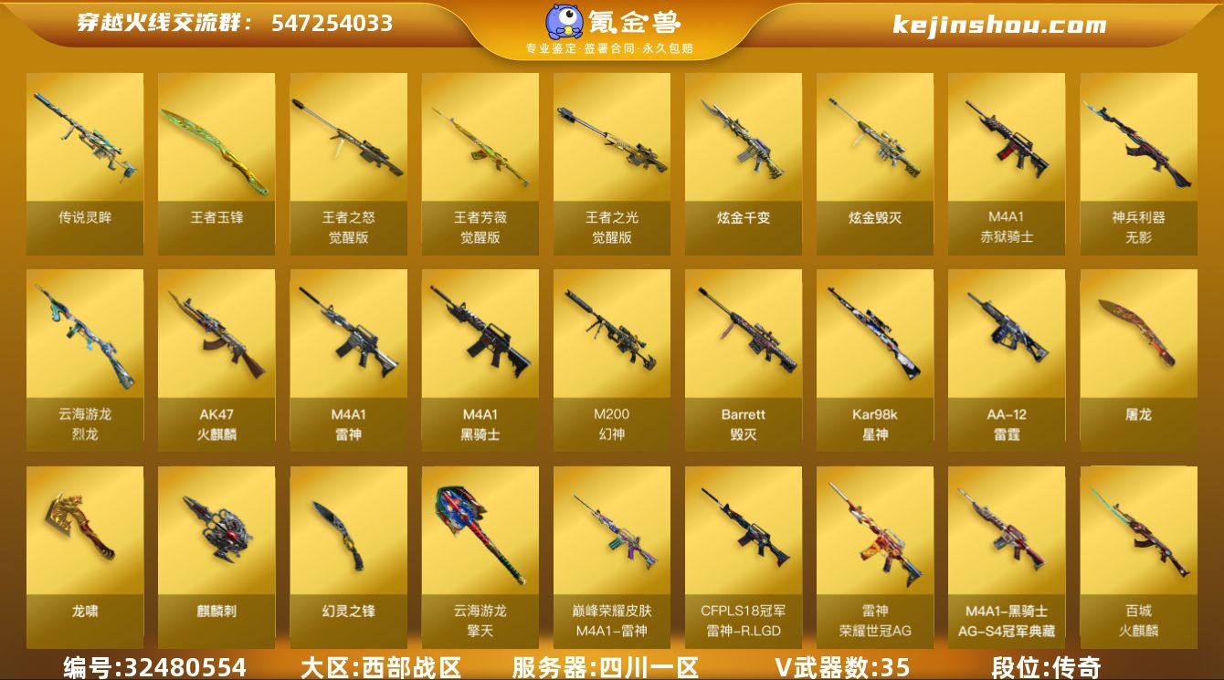 幻神双皮肤 四川一区-43V-4王者武器数-2炫金武器数 【传说武器】:传说灵眸 【热门武器】:传说灵眸,M200-幻神,Kar98K-星神,Cat-刀锋,牛牛-AK47,M4A1-黑骑士,MAC-10-龙宝,M4A1-小神龙,毁灭-孙三炮,裁决-雪莉杨,火麒麟-绝迹,COP-白鲨*5,Knife-冠军之刃 【王者炫金武器】:王者玉锋,炫金千变,炫金毁灭 【音效卡】:AWM-昌龙-怀旧音效卡 【皮肤】:幻神-冠军之幻,幻神-纸灯龙皮肤,星神-璀璨皮肤,雷神-R.LGD-CFPLS18冠军,雷神-荣耀世冠AG,M4A1-雷神-巅峰荣耀皮肤,M4A1-小神龙,火麒麟-平天大圣,火麒麟-百城,火麒麟-大唐荣光,毁灭-冠军之怒,黑骑士-AG-S4冠军典藏,屠龙-星火燎原,龙啸-冠军之啸,龙啸-纸灯龙皮肤 【角色】:葵,鹰,司雨,战地猎狐,王者春,王者影豹,修道士,云海玲珑,暗夜-X,芳心审判者,风暴女*2,嘉年华灵狐,娟娟,兰-新年限定,兰妹妹,灵动武士,灵狐者-X,灵狐者-七夕宝贝,灵狐者-职业经理,龙儿-小淘气,麻雀,曼陀罗-X,潘多拉-X,潘多拉-甜心教官,蜀雪,五号兵器-赛博朋克,夜玫瑰-幻能朋克,樱-战斗天使,影武者-X,幽 【人偶武器】:火麒麟-绝迹,COP-白鲨*5,毁灭-孙三炮,裁决-雪莉杨,白虎-迷你小艾,天龙-曼陀罗,A...
