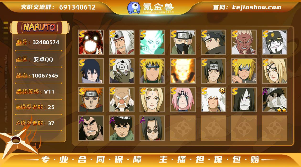 安卓QQ-可以二次-v11-中忍-1006w战力成品号,到手即可畅玩-买到就是赚到-大野木「忍界大战」-漩涡鸣人「暴怒·第六尾」-神秘面具男「红夜之刃」-波风水门「九喇嘛连结」-波风水门「秽土转生」-宇智波斑「五影会谈」-小南「神驹佑将」-宇智波鼬「夏日限定」-桃地再不斩「漂泊武士」-S忍者数:25- A忍者数:37 【S级忍者】大野木「忍界大战」(3星),旗木卡卡西「须佐能乎」(3星),自来也「传说中的三忍」(3星),大筒木舍人「最终章」(3星),漩涡鸣人「暴怒·第六尾」(3星),宇智波斑「秽土转生·解」(3星),宇智波佐助「永恒万花筒」(3星),大筒木桃式(3星),神秘面具男「红夜之刃」(3星),艾「忍界大战」(3星),春野樱「忍界大战」(3星),宇智波止水「须佐能乎」(3星),漩涡鸣人「九喇嘛连结」(3星),波风水门「九喇嘛连结」(3星),宇智波斑「白面具」(3星),波风水门「秽土转生」(3星),自来也「舞之豪杰」(3星),宇智波鼬「须佐能乎」(3星),漩涡鸣人·宇智波佐助(3星),佩恩「天道」(3星),宇智波斑「五影会谈」(3星),波风水门(3星),纲手(3星),大蛇丸(3星),纲手「百豪」(3星), 【A级忍者】宇智波佐助「须佐能乎」(2星),大蛇丸「晓」(2星),药师兜「半蛇斗篷」(2星),旗木卡...
