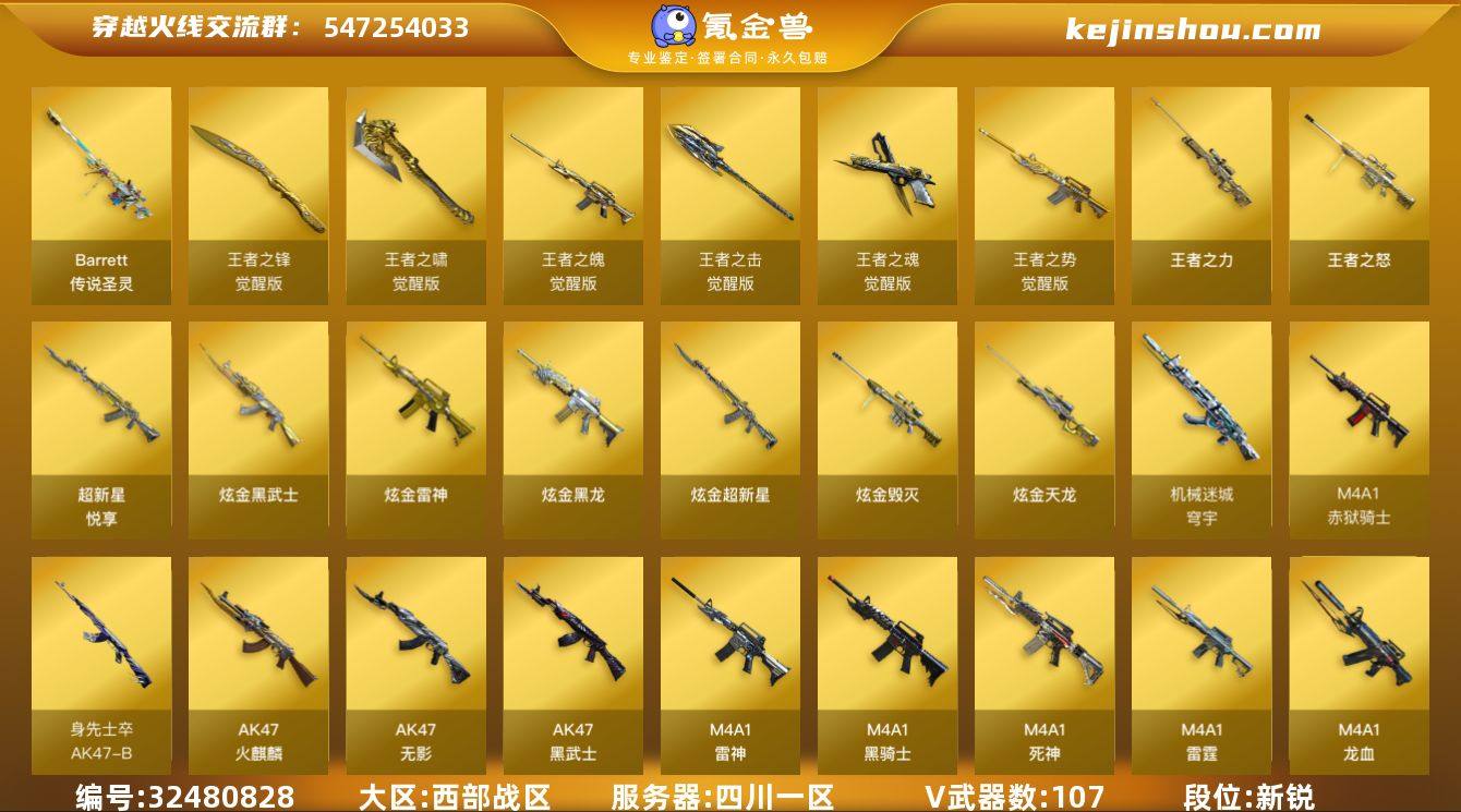 幻神音效卡 四川一区-120V-11王者武器数-6炫金武器数 【传说武器】:传说圣灵 【热门武器】:传说圣灵,QBZ03-金色蔷薇,HK417-朱雀,M4A1-青龙,M200-幻神,M200-竞技荣光,M4A1-黑骑士,加特林-炼狱,USP-雷暴,沙鹰-修罗*4 【王者炫金武器】:超新星-悦享,王者之怒,王者之力,炫金黑龙,炫金雷神,炫金武士,炫金超新星,炫金毁灭,炫金天龙 【音效卡】:M200-幻神音效卡,M4A1-黑骑士音效卡,Barrett-毁灭音效卡,AWM-昌龙-怀旧音效卡 【皮肤】:雷神-能量核心,雷神-星空,毁灭-荣耀之怒,毁灭-星空,毁灭-战神张飞,毁灭-黑大圣皮肤,黑骑士-地狱火,战神-粉色甜心皮肤*2,战神-紫绶金章皮肤,AK47-B-常胜将军-曹操*2,AK47-B-常胜将军-刘备*2,修罗-星空 【角色】:葵,魅影,炫,电竞教官-云悠悠,战地猎狐,王者-瞳-闭月羞花,王者-葵-貂蝉,王者之瞳,王者复仇,王者玲珑-小乔,乔伊教练,修道士,云海玲珑,北极狐-X,初恋灵狐,风暴女,嘉年华灵狐,龙儿,铁骑荣耀,王者-零-传说之路,影武者-X 【人偶武器】:AWM-灵狐-15周年嘉年华,M37-葵,COP-旗袍,深渊终结者手雷,闪光弹-小乔,闪光弹-貂蝉,高爆手雷-大乔 【挑战大师】:冰龙粉碎者-白马银枪,激光毁灭...