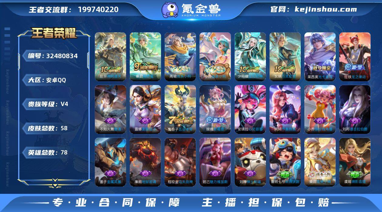 【WZ181515】58皮肤-3传说-19史诗【传说皮肤】:貂蝉神骥聚万邦,后羿神树通天,桑启鸣野蒿【限定皮肤】:狄仁杰万华元夜,项羽海滩派对,李元芳云中旅人,钟馗驱傩正仪,鬼谷子原初探秘者,鬼谷子五谷丰年,嫦娥拒霜思,艾琳女武神【赛季限定】:鬼谷子原初探秘者,狄仁杰万华元夜,钟馗驱傩正仪,李元芳云中旅人【战令限定】:莱西奥光弋星穹,明世隐往忆晖光,周瑜线条小狗,小乔线条小狗【史诗皮肤】:太乙真人瓦猫非猫,周瑜线条小狗,小乔线条小狗,少司缘巫礼祀神,女娲万灵启世,莱西奥光弋星穹,狂铁龙之律动,鬼谷子五谷丰年,嫦娥拒霜思,不知火舞魅语,阿轲节奏热浪,程咬金功夫厨神,安琪拉心灵骇客,小乔缤纷独角兽,刘邦德古拉伯爵,刘禅绅士熊喵,墨子金属风暴,妲己魅力维加斯,廉颇地狱岩魂,露娜紫霞仙子【其他皮肤】:鲁班七号班班快跑,桑启线条小狗,虞姬溯影追猎,艾琳鹤鸣心笺,明世隐往忆晖光,影魅影绮裳,典韦铁骨偃魂,苍苍林狼骑,李元芳云中旅人,钟馗驱傩正仪,狄仁杰万华元夜,鬼谷子原初探秘者,小乔丁香结,大乔守护之力,王昭君幻想奇妙夜,刘备汉昭烈帝,张飞五福同心,典韦黄金武士,妲己少女阿狸,姜子牙时尚教父,安琪拉玩偶对对碰,...