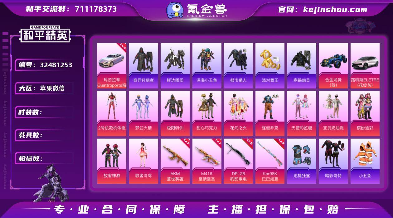 编号23803 果V可改,地铁满天赋,螳螂,小丑,寒蝎,都市,金鞋子,新101,巧克力,猪妹,放客,3级玛莎,盖世,至情至圣,15特2计数11淘汰,3载具1僚机,24粉