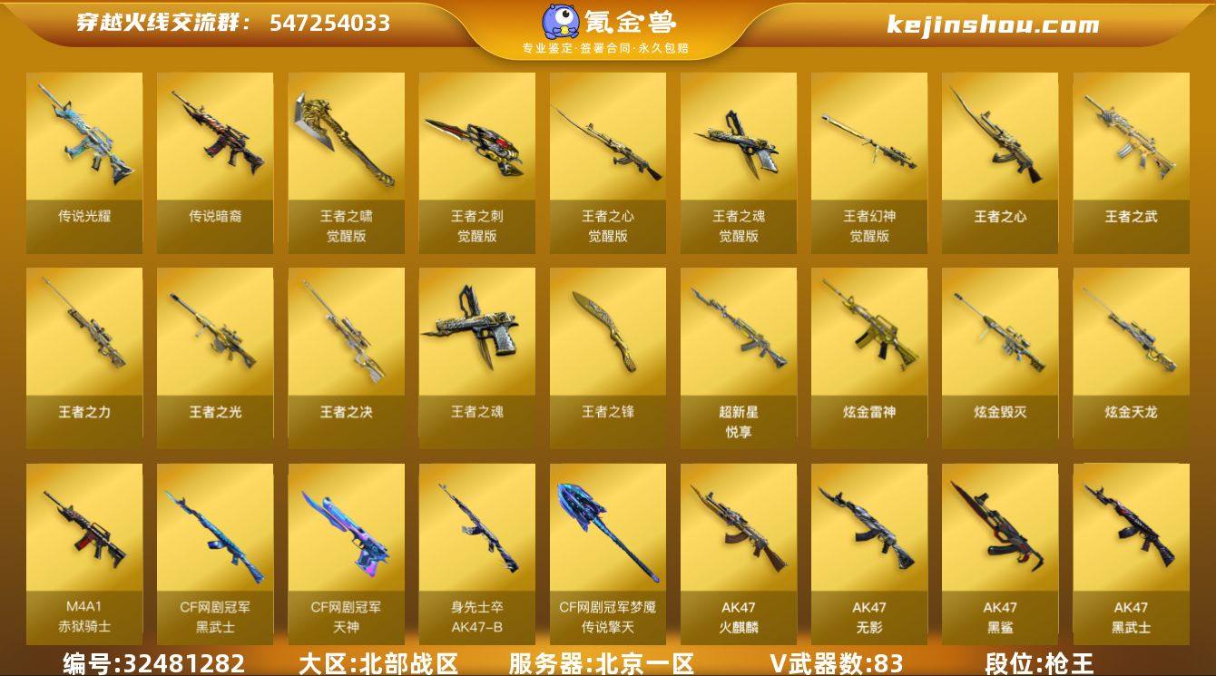 1幻神皮肤!2传说武器!北京一区-92V-18王者武器数-4炫金武器数 【传说武器】:传说光耀,传说暗裔 【热门武器】:传说光耀,传说暗裔,QBZ03-金色蔷薇,Scar Light-白虎,HK417-朱雀,M4A1-青龙,M200-幻神,死亡之眼,荣耀世冠-柯尔特*2,Kar98K-星神,金色小号,C.A.T,M4A1-黑骑士,汤姆逊-烈龙*4,RPK-盘龙,加特林-炼狱*5,斯泰尔-蝴蝶,羊驼玩偶,COP-白鲨,沙鹰-修罗*3 【王者炫金武器】:超新星-悦享,王者之武,王者之心,王者之决,王者之光,王者之力,王者之魂,王者之锋*2,烟雾弹-雷霆王者,炫金雷神,炫金毁灭*2,炫金天龙 【音效卡】:AK47-火麒麟音效卡,M4A1-雷神音效卡,M4A1-黑骑士音效卡,Barrett-毁灭音效卡 【皮肤】:幻神-青鹤,雷神-暗月,雷神-虎将*3,雷神-烈虎皮肤,雷神-机甲刑天皮肤,火麒麟-雷神,火麒麟-冠军之心,火麒麟-华夏之心,火麒麟-战神关羽,火麒麟-平天大圣,火麒麟-百城,毁灭耀金皮肤,毁灭-AG-CFPLS15冠军,毁灭-CFS2020,毁灭-风暴,M4A1-黑龙-361,黑龙-墨子皮肤,黑骑士-冠军之势,无影-霓裳皮肤,战神-粉色甜心皮肤,战神-紫绶金章皮肤*4,战神-流金岁月皮肤,AK47-B-常胜将军-曹操,天龙-能量核心,AWM-天龙-传奇70KG,AW...