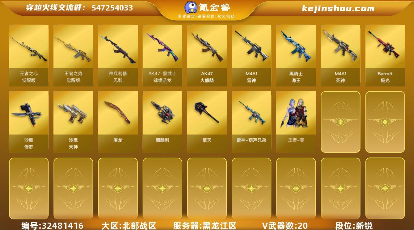 DSCF623【20V 王者之势/心-觉醒版 锦绣游龙 无影-神兵利器】【等级】85【区服】黑龙江区【英雄角色】1【英雄武器】20【王者级武器】王者之势-觉醒版 王者之心-觉醒版【英雄级角色】零【英雄级武器】黑武士-锦绣游龙 龙啸-烈火龙威 沙鹰-修罗 手雷-动感闪耀 无影-神兵利器 AK47-火麒麟 闪光弹-幻灵 沙鹰-修罗 雷神-葫芦兄弟 麒麟刺 擎天 沙鹰-天神 M4A1-雷神 黑骑士-海王 黑骑士-海王 M4A1-死神 沙鹰-修罗 沙鹰-天神 屠龙 Barrett-极光【源级武器】源·HK417-朱雀 源·玫瑰精灵 魂·裁决-羽掣 魂·雷神-诺拉 源·天神 源·无影 源-极光 源-黑龙 源·麒麟刺 源·天启 魂·黑骑士-娜塔莉娅 源·雷神 魂·雷神-新春神龙 魂·雷神-维纳斯 魂·毁灭-墨兰 源·机械迷城 魂·炼狱-月 魂·雷神-宇航兔兔 魂·雷神-15周年嘉年华 魂·修罗-15周年嘉年华 源-裁决 源·猎神 火麒麟-暗月 源·猎神 源·无影 源·雷神 源·毁灭 源·天龙 源·火麒麟 源·雷神 御·黑骑士-白马银枪 魂·黑鲨-青花瓷 魂·黑骑士-现代金属 御·雷神-烈虎 魂·黑鲨-青花瓷 魂·龙啸-NICE 魂·黑骑士-现代金属 魂·修罗-现代金属 源·擎天-萌杀 魂·毁灭-青帝 源·擎天-萌杀 魂·QBZ03-金色蔷薇-萌杀 魂·裁决-新人王绿豆 御·雷神-烈虎 御·麒麟-18 御·黑骑...