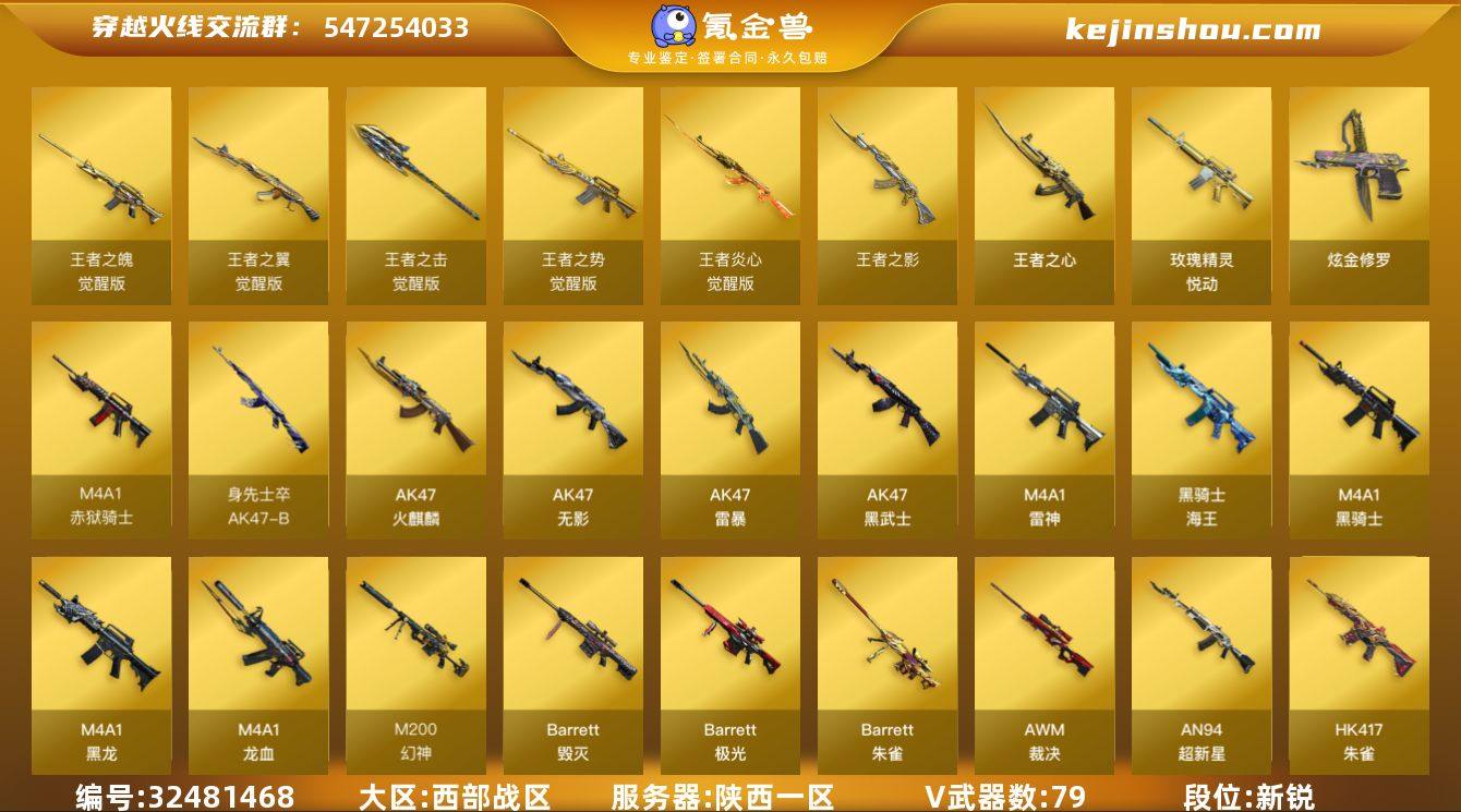幻神宠儿 陕西一区-89V-10王者武器数-1炫金武器数 【热门武器】:HK417-朱雀,M200-幻神,死亡之眼,C.A.T,M4A1-黑骑士*3,汤姆逊-烈龙*3,RPK-盘龙*3,加特林-炼狱*3,斯泰尔-蝴蝶,羊驼玩偶,USP-雷暴,沙鹰-修罗 【王者炫金武器】:玫瑰精灵-悦动,王者之影*2,王者之心,炫金修罗 【音效卡】:AK47-火麒麟音效卡,M4A1-黑骑士音效卡,Barrett-毁灭音效卡 【皮肤】:幻神-宠儿-2021MVP,汤姆逊-烈龙-末日皮肤,雷神-暗月,雷神-传奇N9,雷神-宠儿-2019MVP,火麒麟-平天大圣,毁灭耀金皮肤,毁灭-战神张飞,毁灭-BEAN-2020MVP,毁灭-风暴,无影-能量核心,战神-粉色甜心皮肤,战神-紫绶金章皮肤,战神-流金岁月皮肤,AK47-B-常胜将军-曹操,AK47-B-常胜将军-刘备,极光-能量核心 【角色】:葵,樱,春,战地猎狐,王者之瞳,修道士,炽天使,风暴女,嘉年华灵狐,荆棘玫瑰,零-水下丽影,灵狐者-X,潘多拉-X,青霞仙子,蜀雪,铁骑荣耀 【人偶武器】:斯泰尔-蝴蝶,AWM-灵狐-15周年嘉年华,COP-旗袍,C.A.T,迷你裂空之翼,迷你牛牛,迷你生化手雷,闪光弹-小乔,闪光弹-貂蝉,高爆手雷-大乔 【暴走生化】:死亡之眼,超级对讲机 【挑战大师】:冰龙粉碎者-白马银枪,激光...