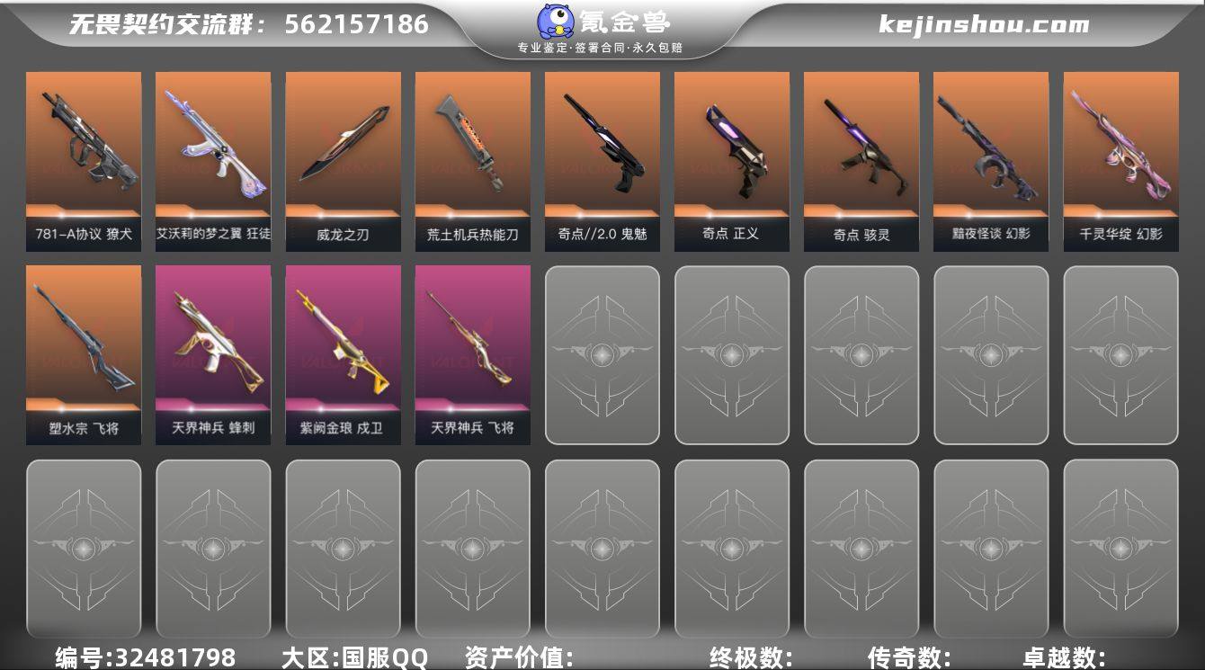 XSQY40【游戏等级】Lv205 【段位】 未定级 【R点】1,275 【皮肤总价值】42,920 【英雄数量】28 【皮肤数量】70 【挂饰数量】74 【卡面数量】116 【喷漆数量】81 【近战武器】近战武器-流风回雪 近战武器-碎心裂刃 近战武器-威龙之刃 近战武器-荒土机兵热能刀 近战武器-超限闪存匕首 近战武器-奇点//2.0蝴蝶刀 【幻影】幻影-异鳞魔蛇 幻影-甜心猎手 幻影-黯夜怪谈 幻影-千灵华绽 幻影-纳米打击 幻影-超限闪存 幻影-奇点 【鬼魅】鬼魅-幻心猎手 鬼魅-宿怨 鬼魅-诡秘蛇影 鬼魅-星云暗涌 鬼魅-模拟赫兹 鬼魅-奇点//2.0 【飞将】飞将-塑水宗 飞将-天界神兵 【标配】标配-电音光谱 标配-星际猎兵 标配-阿特拉斯指挥部 标配-荒土机兵 标配-浮光跃金 【莽侠】莽侠-神中神罚 莽侠-甜心猎手 莽侠-超限闪存 【冥驹】冥驹-诛心猎手 冥驹-掠影 冥驹-荒土机兵 冥驹-模拟赫兹 【戍卫】戍卫-甜心猎手 戍卫-紫阙金琅 戍卫-逆冲蛮牛 戍卫-浮光跃金 【正义】正义-诛心猎手 正义-日耀风暴 正义-纳米打击 正义-超限闪存 正义-奇点 【狂徒】狂徒-幻心猎手 狂徒-上古龙炎 狂徒-掠影 狂徒-塑水宗 狂徒-荒土机兵 狂徒-艾沃莉的梦之翼 狂徒-海洋之星 狂徒-奇点//2.0 【战神】战神-般若假面//2.0 战神-浮...