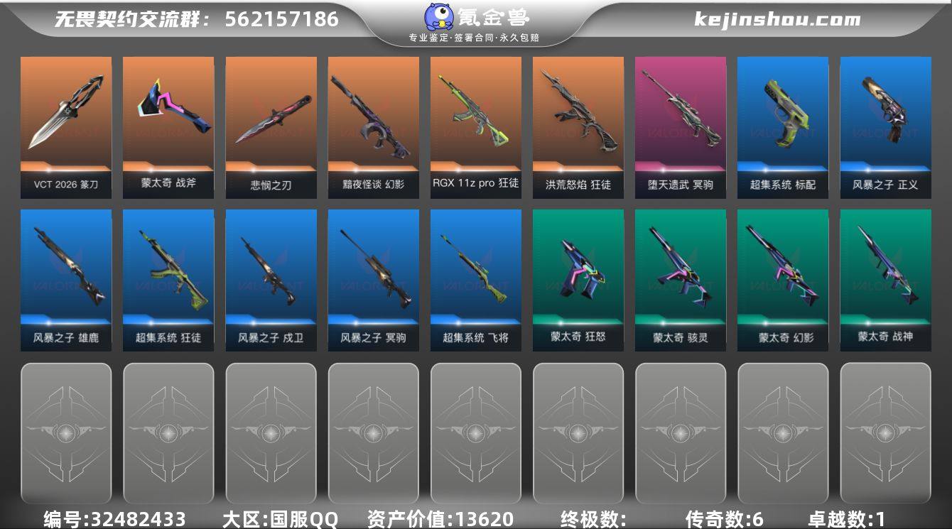 段位: 黄金 亮点皮肤: 悲悯之刃 近战武器皮肤: 无畏契约季前邀请赛 悲悯之刃,蒙太奇 战斧,VCT 2026 篆刀 步枪皮肤: 狂徒-洪荒怒焰,幻影-黯夜怪谈,狂徒-RGX 11z pro,超集系统 狂徒,蒙太奇 幻影,风暴之子 戍卫 佩枪皮肤: 超集系统 标配,风暴之子 正义,蒙太奇 狂怒 狙击枪皮肤: 冥驹-堕天遗武,风暴之子 冥驹,超集系统 飞将 冲锋枪皮肤: 蒙太奇 骇灵 霰弹枪皮肤: 风暴之子 雄鹿 机枪皮肤: 蒙太奇 战神 亮点: 【优质装备】:悲悯之刃,冥驹-堕天遗武,狂徒-洪荒怒焰,幻影-黯夜怪谈,狂徒-RGX 11z pro