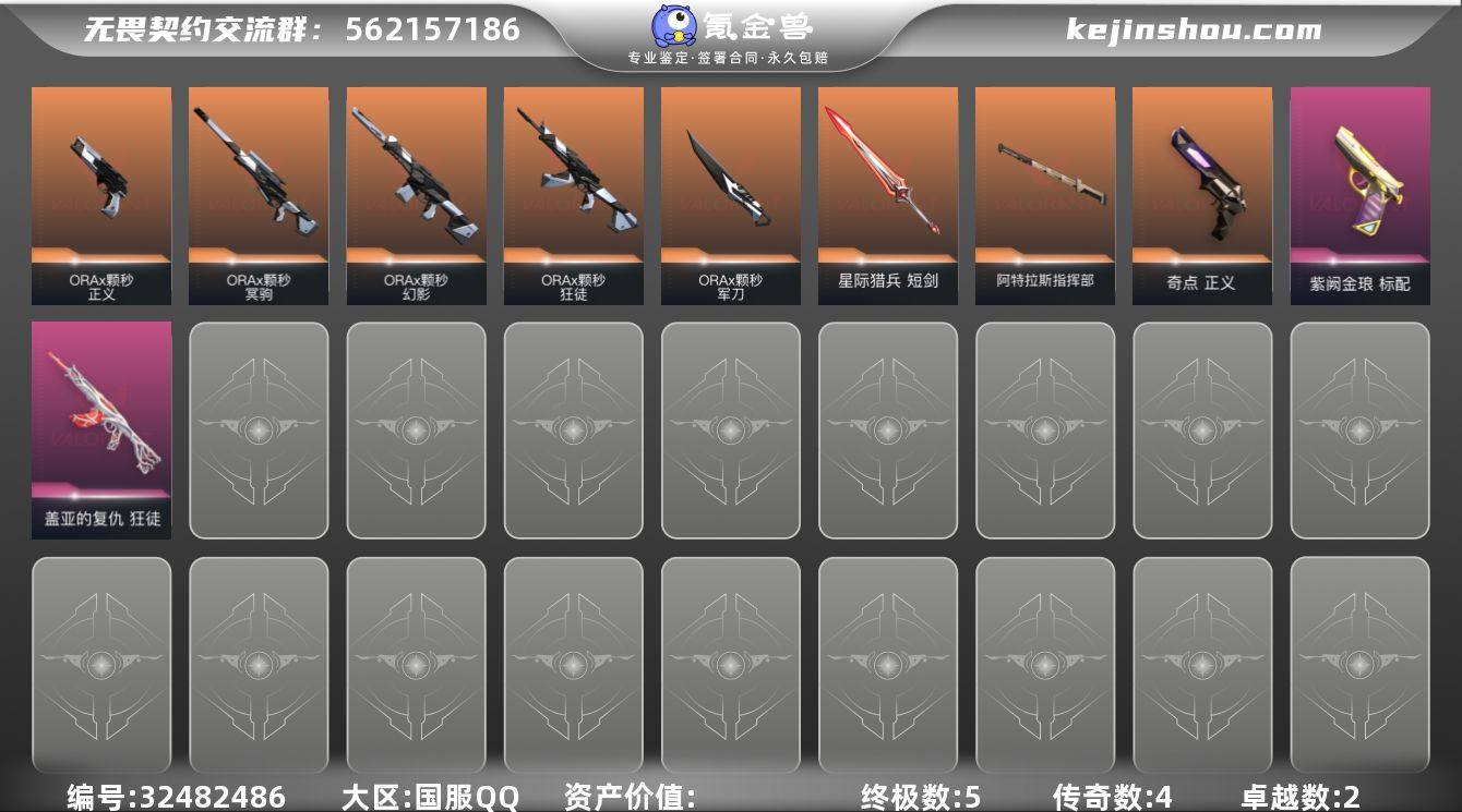 【WWZG377】终极*5/传奇*4/卓越*2/皮肤*47/等级*78/段位:青铜/ORAx颗秒/幻棱/炼狱/暮蝶/壹决/铁臂/捷风/雷兹/不死鸟/贤者/猎枭/芮娜/尚勃勒/霓虹/夜露/K/O/盖可/黑梦/钢锁/近战武器-碎心裂刃/ORAx颗秒 军刀/阿特拉斯指挥部/星际猎兵 短剑/狂徒-ORAx颗秒/狂徒-盖亚的复仇/幻影-ORAx颗秒/冥驹-ORAx颗秒/骇灵-无限竞技/标配-紫阙金琅/正义-奇点/正义-ORAx颗秒/Clutch 卡面/零点嗅探设计图 卡面/代号红色 卡面/新兵报到 卡面/V契约 卡面/无畏契约 卡面/胜利属于无畏契约 喷漆/GLHF 喷漆/无畏契约 喷漆/无畏契约GO!第一卷 零 挂饰/海豹的认可 挂饰/无畏契约 纪念币 挂饰