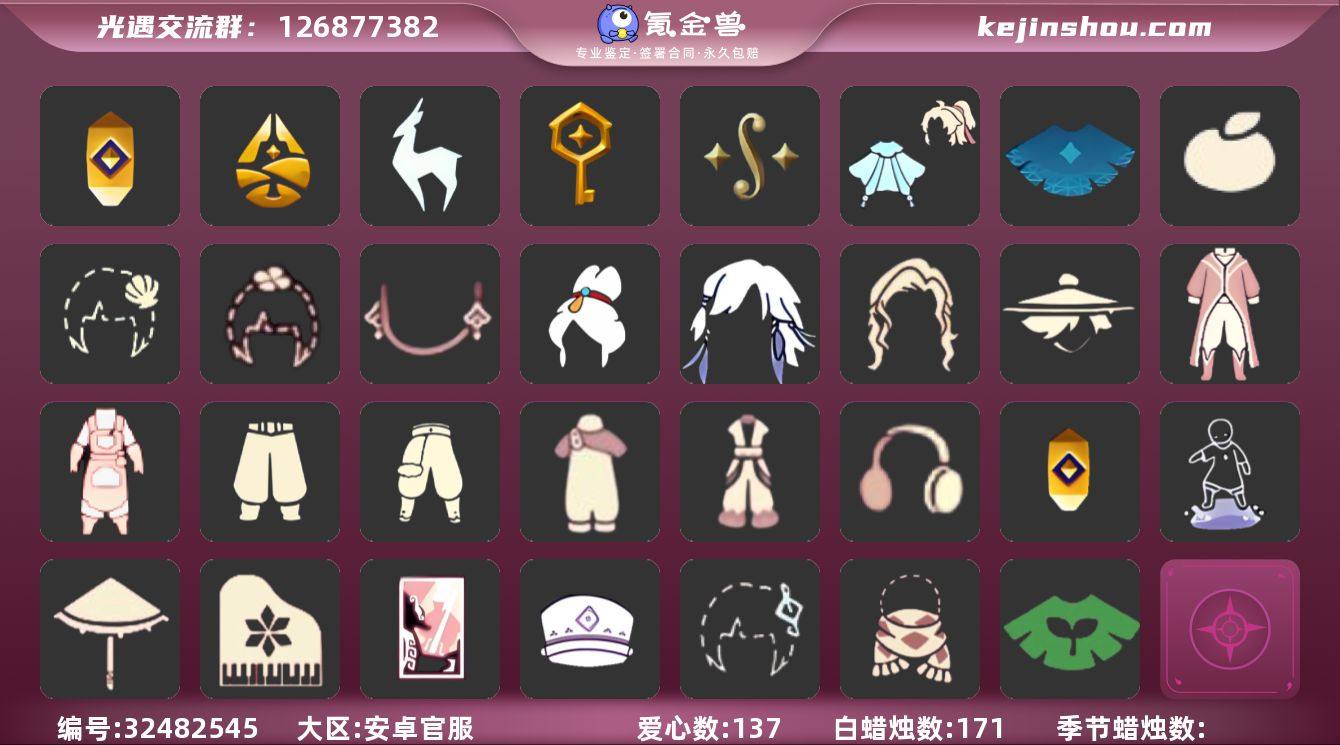 账号类型: 邮箱账号 季节已毕业: 追忆季,归巢季,九色鹿季,筑巢季,二重奏季 珍稀物品: 彩虹围巾 礼包: 橘子,贝壳,四叶草,新年耳钉,青衫落拓礼包,线框斗篷礼包 裤子: 武士裤,背带裤,搓澡巾,飞天裤,筑巢季·裤子,青鸟尊贵蓬头裤子 面饰: 红耳机 项链: 围巾 发型: 归巢毕业发型,若笠,虚荣,飞天盘发 头饰: 蓝色音乐会,平顶帽 斗篷: 绿芽 配饰: 雨伞,筑巢季·小手办,高音钢琴,二重奏挂画,鲲灯 亮点: 【优质装备】:归巢毕业发型(五塑彩羽发),若笠(箬笠),武士裤,青鸟尊贵蓬头裤子(蓝色燕尾服),筑巢季·小手办(光之子试衣),高音钢琴(白色高脚钢琴),追忆季,彩虹围巾(五塑彩带斗),归巢季,九色鹿(九色鹿季),飞天裤(柔缎花边连)(九色鹿丝带裤),围巾(肩带),筑巢季,二重奏季,二重奏挂画(合奏挂画),筑巢季·裤子(设计师长袍),鲲灯(追忆之书),飞天盘发(九色鹿丸子头),线框斗篷礼包(周年线框斗篷),红耳机,青衫落拓礼包,新年耳钉(金鳞耳饰),橘子(大橘大利),贝壳(贝壳发饰),四叶草(四叶草头饰)