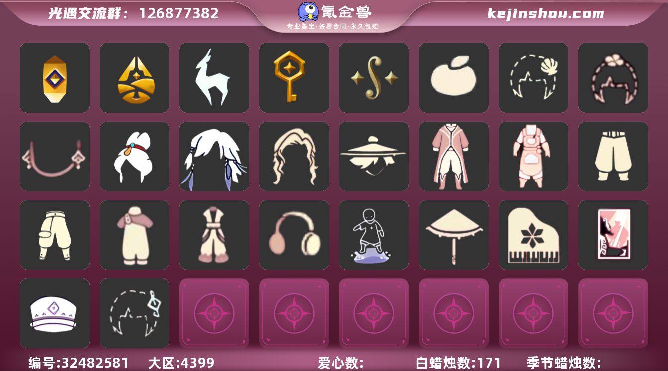 安卓官服 邮箱账号 1珍稀物品 5毕业季 171蜡烛 【珍稀物品】彩虹围巾(五塑彩带斗) 【季节已毕业】追忆季,归巢季,九色鹿(九色鹿季),筑巢季,二重奏季 【礼包】青衫落拓礼包,线框斗篷礼包(周年线框斗篷),橘子(大橘大利),贝壳(贝壳发饰),四叶草(四叶草头饰),新年耳钉(金鳞耳饰) 【裤子】筑巢季·裤子(设计师长袍),青鸟尊贵蓬头裤子(蓝色燕尾服),飞天裤(柔缎花边连)(九色鹿丝带裤),武士裤,背带裤,搓澡巾 【面饰】红耳机 【项链】围巾(肩带) 【发型】飞天盘发(九色鹿丸子头),虚荣,归巢毕业发型(五塑彩羽发),若笠(箬笠) 【头饰】平顶帽,蓝色音乐会(蓝色音乐符) 【斗篷】绿芽 【配饰】鲲灯(追忆之书),二重奏挂画(合奏挂画),雨伞,筑巢季·小手办(光之子试衣),高音钢琴(白色高脚钢琴)