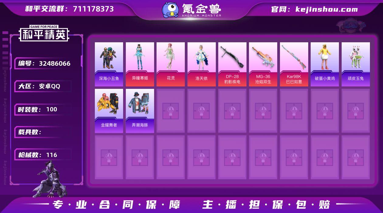 【937642】DYH17973【身法号3粉装5特效1飞行器 小丑鱼 洛天依 深海小丑鱼 】安卓手Q-3粉装-5特效枪-100套装-116枪皮-6王牌印记-超级王牌2星-35517热力值【3粉装】角色-花灵,角色-洛天依,角色-异瞳寒姬【5特效枪】ACE32-萌骑漫游[1级],Kar98K-巳巳如意[5级],DP-28-豹影疾电[5级],MG-36-沧焰双生[5级],Mk14-福马献瑞[5级]【2稀有】小丑鱼,深海小丑鱼【8飞行器】狂鲨锋刃飞行器,鸡智如我飞行器,云朵驼驼飞行器,马上有福飞行器,炫彩糖果飞行器,异域银装飞行器,登顶巅峰飞行器,光之冒险尾迹【206其它衣服和枪皮】角色-紫俏灵猫,湖蓝色名流,SS33特训,黄色运动,角色-蜜桃派对,粉黛兰香,都市魅力,霓虹街区,完美偶像,玩偶服-美羊羊,破蛋小黄鸡,魅力单车,擎苍青焰,黄色名流,画境星梦,SS32特训,书海巡游,弄潮海豚,猎鹰,冷焰舞者,星途旅人,福马献瑞,海岛探路者,黄色伏地魔,天籁歌者,电音精灵,街头风暴,马上来财,白熊同盟,战术大师,黑色伏地魔,凌霄紫焰,旭日情侣,金耀舞者,红色运动,风迹短诗,狂鲨锋刃,巳巳如意,SS36特训,疯狂小兔子,特训学院,深蓝色名流,角色-糖霜甜心,海盐绵绵冰,萌鸡速递,白色伏地魔,朱霞炽焰,午间小调,SS25特训,炫彩糖果,SS29特训,橘黑制服,玩偶服-懒羊羊,SS34特训,SS35...