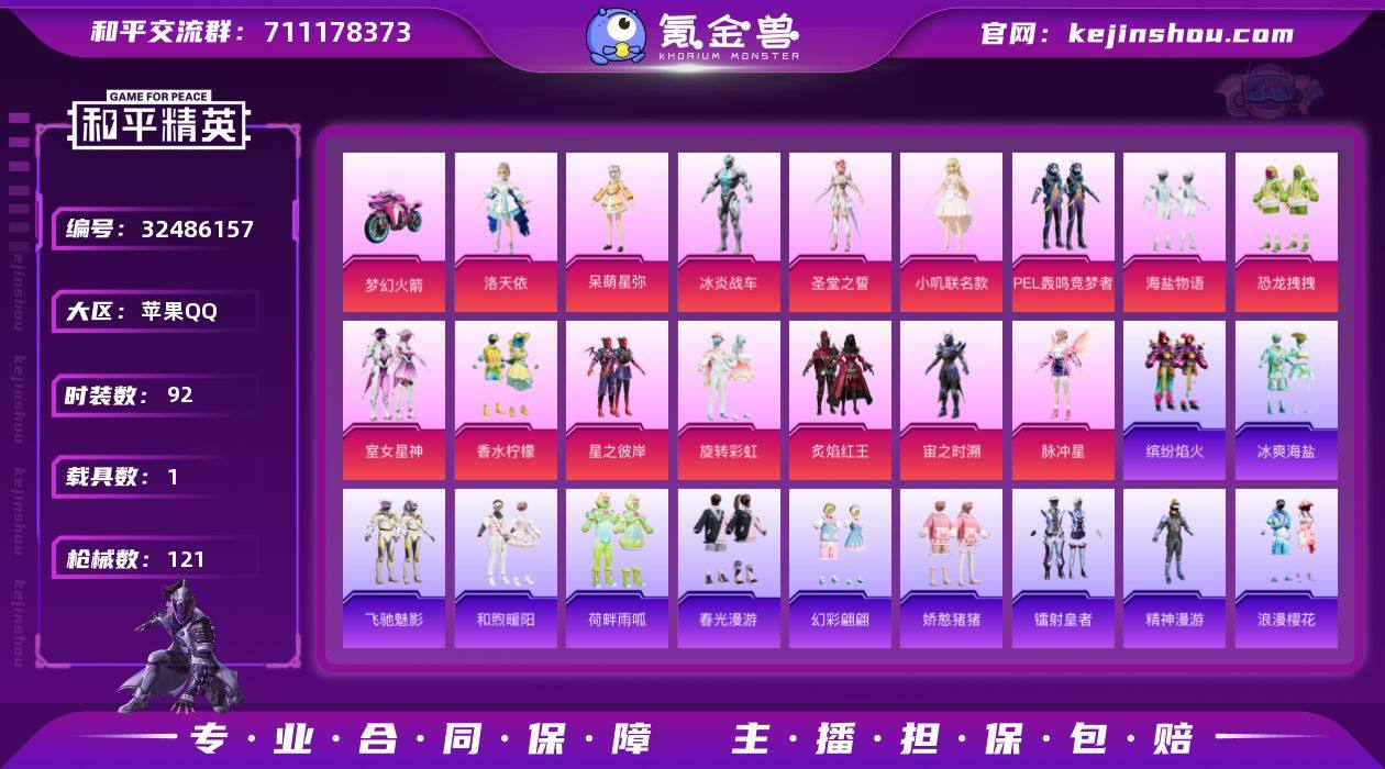 【和平精英】15粉装,10特效枪,1载具,历史最高段位:超级王牌3星 王牌印记4次 热力值:69378,129套装,201枪械,216装备,97战备;套装:套装-PEL轰鸣竞梦者,套装-炙焰红王,套装-室女星神,套装-香水柠檬,角色-洛天依,套装-星之彼岸,套装-恐龙拽拽,套装-海盐物语,套装-旋转彩虹,角色-呆萌星弥,角色-宙之时溯,角色-冰炎战车,角色-圣堂之誓,角色-小叽联名款,角色-脉冲星,套装-白色伏地魔,套装-黑色伏地魔,套装-竞技名士,套装-深蓝色名流,套装-长空猛禽,套装-竞技勇士朋克,套装-蓝色守护者,套装-甜蜜告白,套装-燃烧卡路里,套装-冰冻风暴,套装-海滨突袭者,套装-酷萌兔限定,套装-绮丽涂鸦,套装-热血青春,套装-丛林猎人,套装-雪山精英,套装-传奇侦探,套装-幻世战舞者,套装-龙魂突击队,套装-麻辣教官,套装-粉红小猪,套装-疯狂小兔子,套装-深蓝冒险家,套装-迷域探索者,套装-红酒骑士,套装-金鼠迎春,套装-北国孤狼,套装-SS6特训,套装-拳皇97草薙京,套装-炽焰拳师,套装-格斗专家,套装-跃动心情,套装-SS7特训,套装-核芯基因,套装-精神漫游,套装-霓虹街区,套装-SS10特训,套装-SS8特训,套装-众神之王,套装-智慧之神,套装-夏日音浪...