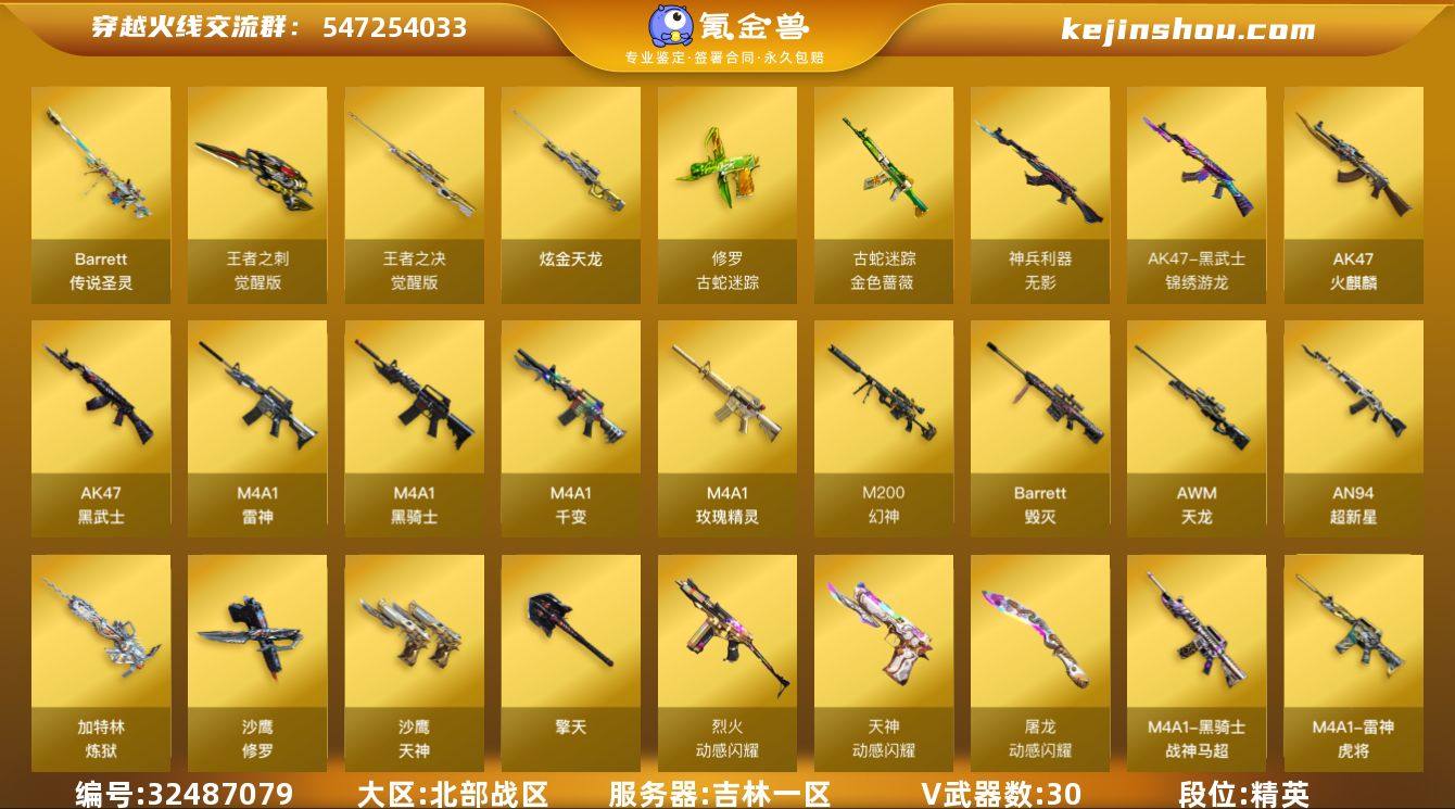 【937756】吉林一区-31V-2王者武器数-1炫金武器数 【传说武器】:传说圣灵 【热门武器】:传说圣灵,M200-幻神,金色蔷薇-古蛇迷踪,修罗-古蛇迷踪,M4A1-黑骑士,加特林-炼狱,沙鹰-修罗 【王者炫金武器】:炫金天龙 【皮肤】:M200-幻神-黄忠皮肤,雷神-暗月,雷神-虎将,雷神-源计划2.0专属 皮肤,毁灭-风暴,黑骑士-战神马超,无影-霓裳皮肤,战神-流金岁月皮肤 【角色】:零,堕落女神,蛇隐宗,乔伊教练,飞虎队-X,风暴女,嘉年华灵狐,兰-新年限定,灵动武士,灵狐者-X,麻雀,青霞仙子,蛇姬,斯沃特-X,游珑儿 【人偶武器】:白虎-迷你小艾,M4A1-雷神-精英刀锋,AWM-灵狐-15周年嘉年华,生化手雷-机甲核心*2 【暴走生化】:超级对讲机 【挑战大师】:神圣爆裂者-末日III 【英雄级武器】:M4A1-千变,AK47-火麒麟,M4A1-雷神,M4A1-黑骑士,AK47-黑武士,AN94-超新星,无影-神兵利器,黑武士-锦绣游龙,金色蔷薇-古蛇迷踪,M4A1-玫瑰精灵,烈火-动感闪耀,AWM-天龙*2,Barrett-毁灭,M200-幻神,王者之决-觉醒版,加特林-炼狱,沙鹰-修罗,沙鹰-天神*3,天神-动感闪耀,修罗-古蛇迷踪,擎天,屠龙-动感闪耀,王者之刺-觉醒版,高爆手雷-幻灵*3,手雷-动感闪耀,高爆...