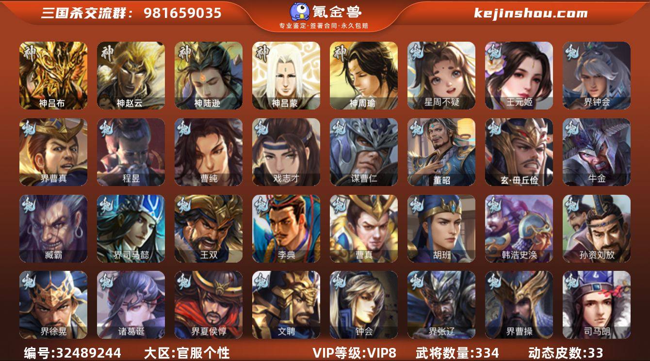 官阶:大将军;VIP等级:VIP8;史诗武将数量:33;动态皮肤数量:33;武将总数:334;史诗宝珠数量:0;将魂数量:11000;神将:3;魏国史诗武将:26;蜀国史诗武将:7;吴国史诗武将:3;群史诗武将:12