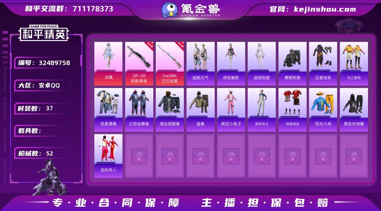 安卓 手Q-1粉装-4特效枪-0载具-1粉色飞行器-14981热力值-2王牌印记-37套装-52枪皮 【热门品类】:套装-忍者信条 【粉色套装】:角色-冰魄 【粉色枪皮等级】:ACE32-萌骑漫游(五级),Kar98K-巳巳如意(四级),Mk14-福马献瑞(五级),DP-28-豹影疾电(四级) 【粉色枪皮】:ACE32-萌骑漫游,Kar98K-巳巳如意,Mk14-福马献瑞,DP-28-豹影疾电 【粉色飞行器】:炫彩糖果飞行器 【粉色降落伞】:绝对恒星降落伞,洛神天依降落伞,极意拳锋降落伞,炫彩糖果降落伞 【稀有套装】:套装-超能元气,角色-超感刻度,套装-雪国风尚,套装-炫彩糖果,套装-马上有钱,角色-绯色魅影,套装-雨过天青,套装-红釉青花 【稀有枪皮】:AUG-冰晶雪宝,SCAR-L-玉兔迎春,SCAR-L-红色方程式,M416-红色方程式,UZI-影袭,UMP45-夜灯,Vector-生命誓言,汤姆逊-天降萌叽,汤姆逊-像素花束,M24-影袭,S12K-夜灯,DP-28-彩虹符号,MG3-幻世战舞者,突击盾牌-绝对恒星 【其他套装】:套装-光之冒险,套装-完美偶像,套装-幻世战舞者,套装-海岛探路者,套装-猛禽,套装-疯狂小兔子,套装-竞技名士,套装-绯格组合,套装-阳光火鸡,套装-黑色伏地魔,套装-龙的传人,套装-鹰眼刺客 【稀有头盔】:金羽特工头...