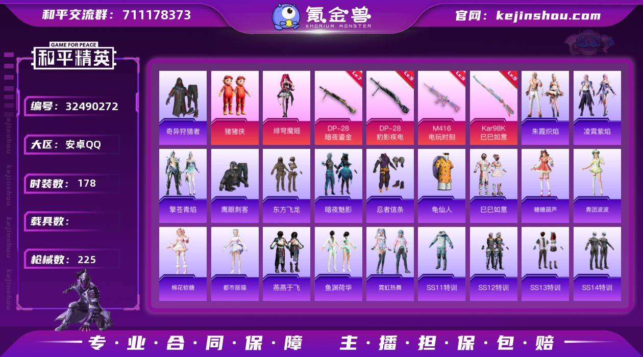 安卓 手Q-2粉装-5特效枪-0载具-0粉色飞行器-68218热力值-16王牌印记-178套装-225枪皮【热门品类】:套装-奇异狩猎者,套装-忍者信条,套装-龟仙人【粉色套装】:玩偶服-猪猪侠,角色-绯穹魔姬【粉色枪皮等级】:M416-电玩时刻(五级),Kar98K-巳巳如意(五级),AA12-G-萌骑幻想(五级),DP-28-暗夜鎏金(七级),DP-28-豹影疾电(五级)【粉色枪皮】:M416-电玩时刻,Kar98K-巳巳如意,AA12-G-萌骑幻想,DP-28-暗夜鎏金,DP-28-豹影疾电【粉色降落伞】:银刃赛罗降落伞,齐天大圣降落伞,海渊国主降落伞,百合蜜语降落伞,橘柚倾心降落伞,炫光之旅降落伞,夜幕颂歌降落伞,猪猪侠降落伞,幻影飞狐降落伞【稀有套装】:套装-龟仙人,套装-巳巳如意,套装-糖糖葫芦,套装-青团波波,套装-棉花软糖,角色-都市丽猫,套装-燕燕于飞,套装-鱼渊荷华,套装-霓虹热舞,套装-朱霞炽焰,套装-凌霄紫焰,套装-擎苍青焰【稀有枪皮】:AKM-彩虹符号,AKM-灼热熔岩,AKM-百万伏特,AKM-破晓战魂,AKM-虎虎生威,AKM-龙的传人,M16A4-幻世战舞者,M16A4-甜心亚梦,M16A4-红色方程式,M16A4-蓝色火焰,M16A4-千金淑猫,SCAR-L-炫彩节奏,SCAR-L-玉兔迎春,SCAR-L-红色方程式,SCAR-L-黄金龙骨,M416...
