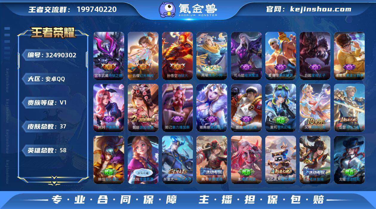 安卓Q-V0-至尊星耀III段位-58英雄-37皮肤-3传说-9史诗【英雄全皮】:影全皮【传说皮肤】:云缨幻光神枪,宫本武藏地狱之眼,孙悟空地狱火【限定皮肤】:甄姬游园惊梦【赛季限定】:东皇太一噬灭天穹,太乙真人谧流熔炉,亚瑟荣光之誓【战令限定】:周瑜线条小狗【史诗皮肤】:周瑜线条小狗,司马懿暗渊魔法,阿轲节奏热浪,白起星夜王子,雅典娜冰冠公主,甄姬游园惊梦,诸葛亮黄金分割率,夏侯惇乘风破浪,妲己魅力维加斯,嬴政摇滚巨星【其他皮肤】:蚩奼极光幻客,艾琳鹤鸣心笺,亚瑟荣光之誓,西施雪境奇遇,影魅影绮裳,典韦铁骨偃魂,太乙真人谧流熔炉,苍苍林狼骑,东皇太一噬灭天穹,戈娅危途狂花,诸葛亮掌控之力,花木兰兔女郎,亚瑟死亡骑士,典韦黄金武士,韩信街头霸王,暃碧珀绯影,司空震启蛰,澜孤猎,镜冰刃幻境,马超幸存者,嫦娥露花倒影,李信灼热之刃,裴擒虎街头旋风,百里玄策威尼斯狂欢【营地ID】:1704600144