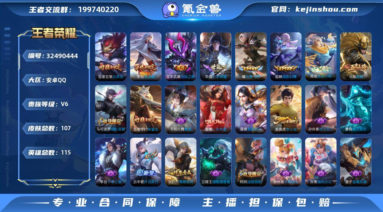 安卓Q-V6-永恒钻石II段位-115英雄-107皮肤-6传说-24史诗【传说皮肤】:曜云鹰飞将,李信一念神魔,貂蝉猫影幻舞,百里玄策白虎志,李白凤求凰,宫本武藏地狱之眼【限定皮肤】:狄仁杰阴阳师,赵云皇家上将,阿轲迷踪丽影,芈月重明,夏侯惇朔风刀,曹操烛龙,马可波罗暗影游猎,狄仁杰魔术师,狄仁杰万华元夜,达摩沙漠行僧,项羽海滩派对,老夫子醍醐杖,露娜一生所爱,刘邦夺宝奇兵,牛魔御旌,李元芳云中旅人,雅典娜单词大作战,鬼谷子原初探秘者,百里玄策白虎志,百里守约朱雀志,弈星混沌棋,沈梦溪大漠名商,明世隐疑决卦,裴擒虎李小龙,米莱狄御霄,云中君纤云弄巧,盾山御銮,猪八戒西部大镖客,蒙犽狂想玩偶喵,鲁班大师探海日志,桑启海盐诗旅,张良古海寻踪,鬼谷子天穹祈灯【年限皮肤】:李白凤求凰,百里玄策白虎志,百里守约朱雀志【赛季限定】:曹操烛龙,芈月重明,米莱狄御霄,牛魔御旌,盾山御銮,夏侯惇朔风刀,弈星混沌棋,明世隐疑决卦,老夫子醍醐杖,鬼谷子原初探秘者,狄仁杰万华元夜,达摩沙漠行僧,沈梦溪大漠名商,李元芳云中旅人,桑启海盐诗旅,鲁班大师探海日志,张良古海寻踪,鬼谷子天穹祈灯【战令限定】:阿轲迷踪丽影,刘邦夺宝奇兵,马...