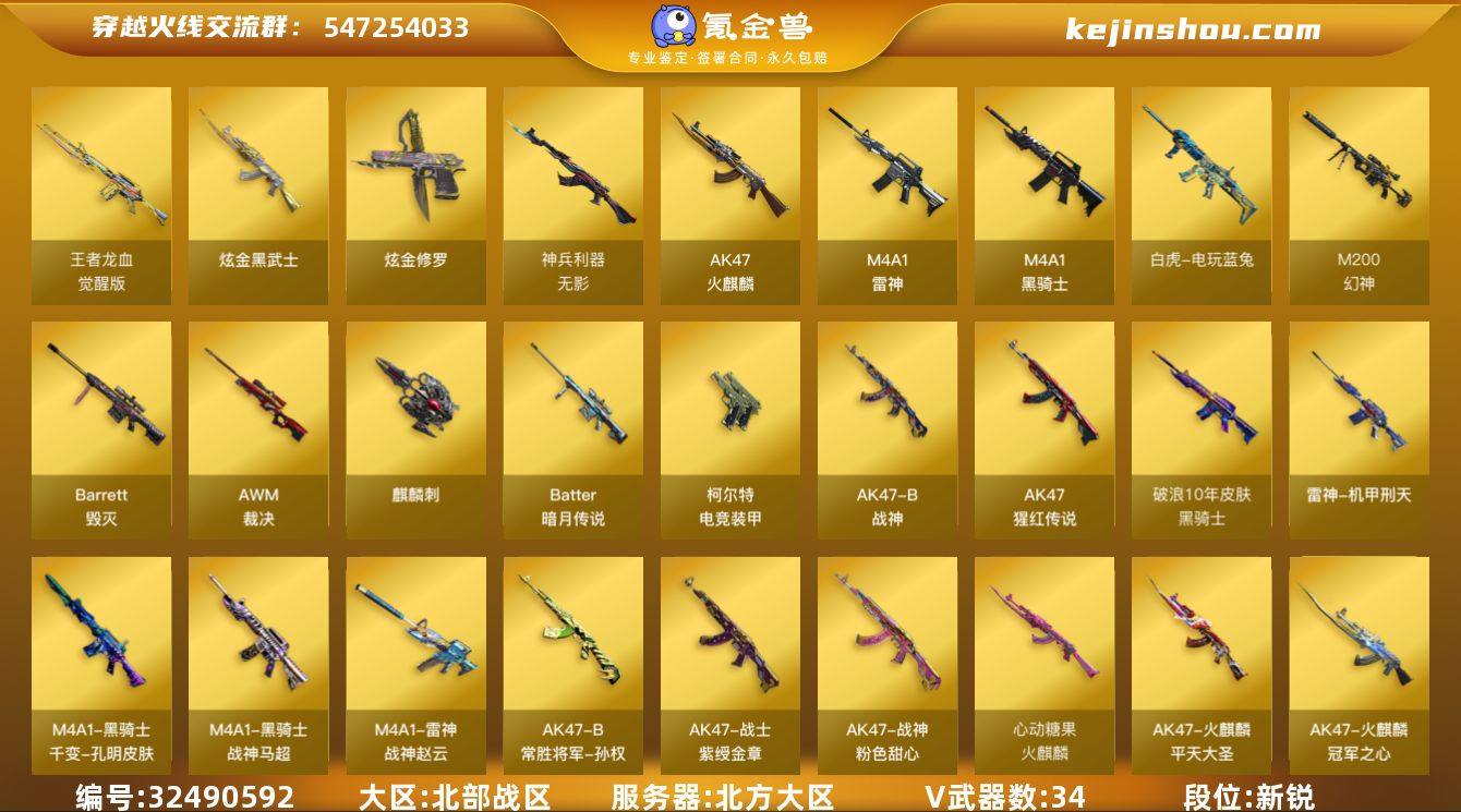 北方大区-37V-1王者武器数-2炫金武器数 【热门武器】:M4A1-青龙,M200-幻神,白虎-电玩蓝兔,M4A1-黑骑士*3,斯泰尔-蝴蝶 【王者炫金武器】:炫金武士,炫金修罗 【皮肤】:裁决-胜者为王 皮肤,雷神-荣耀之魄,M4A1-战神赵云,雷神-机甲刑天皮肤,火麒麟-冠军之心,火麒麟-平天大圣*2,火麒麟-心动糖果,毁灭-荣耀之怒,毁灭-黑大圣皮肤*2,M4A1-千变-孔明皮肤*2,黑骑士-战神马超,黑骑士-破浪10年皮肤,战神-粉色甜心皮肤*2,战神-紫绶金章皮肤*2,AK47-B-常胜将军-孙权,屠龙-荣耀之锋,龙啸-冠军之啸,龙啸-青青莓果 皮肤 【角色】:葵,幻面灵狐,炽天使,初恋灵狐,芳心审判者,风暴女,嘉年华灵狐,娟娟,灵狐者-X,灵狐者-黄金海岸,灵狐者-七夕宝贝,龙儿,龙儿-小淘气,麻雀,曼陀罗-X,潘多拉-X,潘多拉-甜心教官,潜龙队-X,斯沃特-X,兔囡囡,维纳斯,樱-战斗天使,智影 【人偶武器】:天龙-曼陀罗,斯泰尔-蝴蝶,AWM-灵狐-15周年嘉年华,迷你裂空之翼*11,夺魂*2,迷你牛牛*11,深渊终结者手雷,Barrett-夜玫瑰,迷你超能女侍 【暴走生化】:超级对讲机 【挑战大师】:神圣爆裂者III*6,冰龙粉碎者-白马银枪,激光毁灭者III-白马银枪,VEPR-12-金魔*2,激光毁...