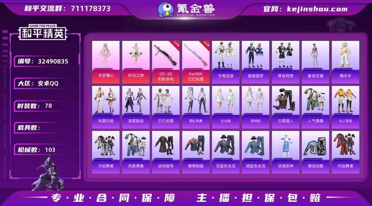 安卓 手Q-2粉装-3特效枪-0载具-1粉色飞行器-25928热力值-2王牌印记-78套装-103枪皮 【粉色套装】:角色-时光之吻,角色-羊梦糖心 【粉色枪皮等级】:Kar98K-巳巳如意(五级),Mk14-福马献瑞(五级),DP-28-豹影疾电(五级) 【粉色枪皮】:Kar98K-巳巳如意,Mk14-福马献瑞,DP-28-豹影疾电 【粉色飞行器】:炫彩糖果飞行器 【粉色降落伞】:绝对恒星降落伞,幻彩电音降落伞,异瞳寒姬降落伞,炫彩糖果降落伞,霁蓝缠春降落伞,虹云熊熊降落伞 【稀有套装】:套装-巳巳如意,套装-雪国风尚,套装-炫彩糖果,套装-马上有钱,套装-霓虹热舞,套装-云朵鹅,套装-雪绒豹,套装-朱霞炽焰,套装-凌霄紫焰,玩偶服-懒羊羊,角色-紫俏灵猫,套装-书海巡游,套装-画境星梦,套装-琴音绮想,角色-孙斩天 【稀有枪皮】:AUG-冰晶雪宝,SCAR-L-炫彩节奏,SCAR-L-玉兔迎春,QBZ-彩虹符号,M762-天降萌叽,M762-云朵鹅,AC-VAL-天降萌叽,蜜獾-虎痴许褚,ACE32-画境星梦,ARX-凌霄紫焰,UZI-啾咪啾咪,UZI-炫彩节奏,Vector-生命誓言,汤姆逊-像素花束,MP5K-画境星梦,JS9-凌霄紫焰,P90-巳巳如意,AWM-暮色玫影,SKS-糯团青竹,VSS-虎痴许褚,AMR-喜羊羊与灰太狼,SVD-云朵鹅,SVD-冷漠罗丽,M1...