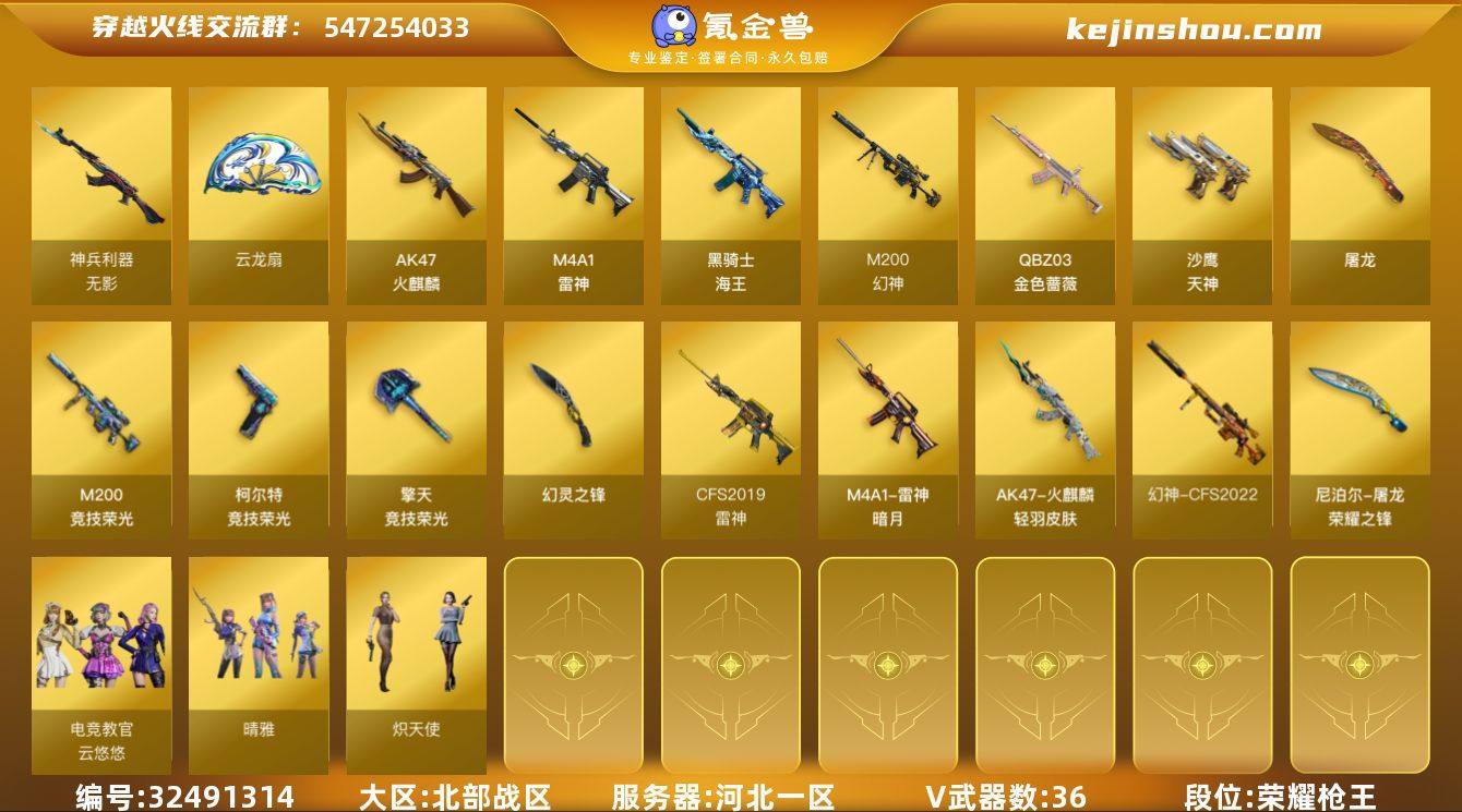 河北一区-38V-0王者武器数-0炫金武器数 【热门武器】:QBZ03-金色蔷薇,M200-幻神,M200-竞技荣光,羊驼玩偶,USP-雷暴,金刚伞 【皮肤】:幻神-CFS2022,雷神-暗月,M4A1-雷神-CFS 2019,火麒麟-轻羽皮肤,屠龙-荣耀之锋 【角色】:电竞教官-云悠悠,晴雅,炽天使,暗夜-X,初恋灵狐,嘉年华灵狐,娟娟,灵狐者-职业经理,麻雀,斯沃特-X 【人偶武器】:生化手雷-机甲核心 【挑战大师】:AK47-冰龙粉碎者,冰龙粉碎者-白马银枪,神圣爆裂者-末日III 【英雄级武器】:AK47-火麒麟,M4A1-雷神,无影-神兵利器,QBZ03-金色蔷薇,黑骑士-海王,天罚-斗烈龙驹,M200-幻神,M200-竞技荣光,Kar98K-量子之心,沙鹰-天神,USP-雷暴,柯尔特-竞技荣光,屠龙,幻灵之锋,擎天-竞技荣光,屠龙-斗烈龙驹,云龙扇,高爆手雷-幻灵*2,高爆手雷-竞技荣光*2,高爆手雷-云龙,高爆手雷-量子之心,闪光弹-幻灵,闪光弹-竞技荣光,闪光弹-神工天巧,闪光弹-云龙,闪光弹-量子之心,烟雾弹-幻灵,烟雾弹-竞技荣光*2,烟雾弹-云龙*2,烟雾弹-量子之心 【源级武器】:源·黑骑士*2,魂·裁决-神秘按键,魂·毁灭-航天科技 【道具】:全能枪王背包,炫彩背包,虎牙炫彩背包,超级背包,夺命之镰,防化服...
