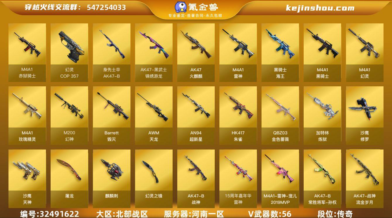 河南一区-57V-0王者武器数-0炫金武器数 【热门武器】:QBZ03-金色蔷薇,HK417-朱雀,M200-幻神,M4A1-黑骑士,加特林-炼狱,COP 357-幻灵*2,沙鹰-修罗*4 【皮肤】:M200-幻神-N9-2022MVP,雷神-宠儿-2019MVP,雷神-15周年嘉年华 皮肤,火麒麟-白虎,毁灭-暗月,无影耀金皮肤,战神-流金岁月皮肤,AK47-B-常胜将军-孙权,修罗-星空*2,屠龙-破浪逐光 皮肤 【角色】:影豹,零·纪元,王者晴雅,蛇隐宗,奇洋探员,乔伊教练,暗夜-X,电竞少女,飞虎队-X,嘉年华灵狐,麻雀,潘多拉-X,蛇姬,维纳斯,夜玫瑰-宠粉,游珑儿 【人偶武器】:AWM-灵狐-15周年嘉年华,迷你牛牛,灵狐娃娃手雷 【英雄级武器】:AK47-火麒麟,M4A1-雷神,M4A1-黑骑士,AN94-超新星,HK417-朱雀,M4A1-幻灵,黑武士-锦绣游龙,M4A1-玫瑰精灵,QBZ03-金色蔷薇,AK47-B-战神,黑骑士-海王,AK47-B-身先士卒,AWM-天龙,Barrett-毁灭,M200-幻神,加特林-炼狱,沙鹰-修罗*4,沙鹰-天神,COP 357-幻灵*2,屠龙,麒麟刺,尼泊尔-雷霆,幻灵之锋*2,高爆手雷-雷霆,高爆手雷-幻灵*7,高爆手雷-云龙,手雷-热带奇洋,高爆手雷-古蛇迷踪,闪光弹-雷霆,闪光弹-幻灵*7,闪光弹-竞技荣光,烟雾弹-雷霆,烟雾弹-幻灵...