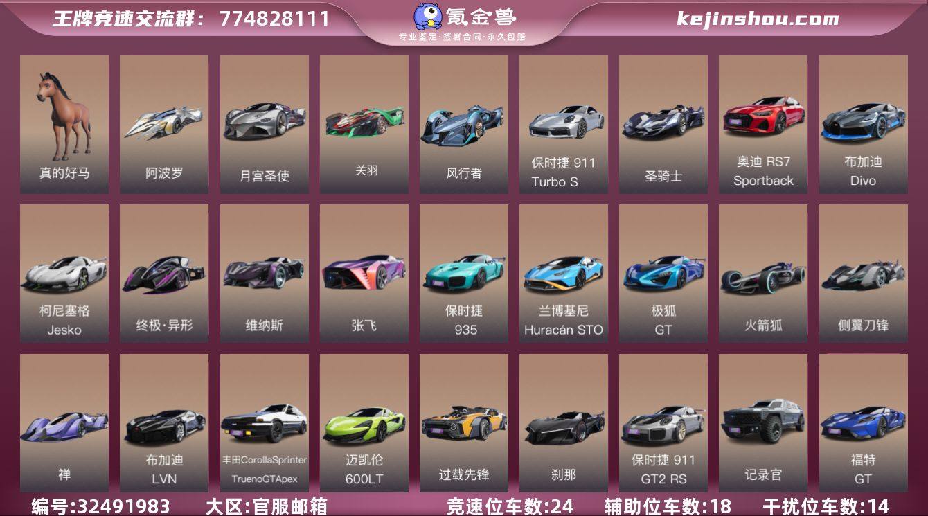价格可谈 服务器:速度节赛车场 竞速位:记录官,圣骑士,保时捷935,火箭狐,风行者,终极·异形,刹那,蔚来EP9, 过载先锋,神剑号,禅,迈凯伦600LT,维纳斯,兰博基尼 Huracán STU, 福特GT,张飞,柯尼塞格 Jesko, 保时捷911G T2 RS, 布加迪 Divo, 丰田 Corolla Sprinter Trueno GT,极狐GT,侧翼刀锋,梅赛德斯-AMG GT Black Se ries, 保时捷-911-Turbo-S 辅助位:幻蝶, 风神,奥迪 TT RS, 摇尾萌萌虎,猫眠梦,团子,比亚迪汉,蛋仔出击,月宫舞灵,道奇Charger SRT Hellcat, 玉麒麟,以太,阿斯顿马丁Van quish,逮虾货运,先驱者,星际探路者,平行巡洋舰。催化剂 干扰位:路虎卫士,魔鬼鱼,坦克 300,逐浪,洛基,沙滩漫步者,寒霜冰魄,泰坦,饿龙传说,干扰者,燃烧太阳,法拉第,开拓铁铲 天平位:关羽,阿波罗,真的好马,月宫圣使 涂装:空力套件-街霸,杰克神剑,奶油小免,光明骑士,3周年纪念,芬芳白玫,黑雾瞬光,草莓萌兔 时装:浮生永恒