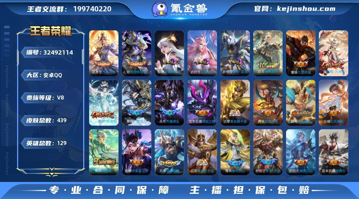 安卓Q-V8-最强王者段位-对抗路28段,打野20段,3星元零号雷霆,幻海之心,金色仲夏夜,129英雄-439皮肤-2典藏皮肤-1典藏英雄-21传说-130史诗 【英雄全皮】:刘邦全皮,孙权全皮,敖隐全皮,蒙恬全皮,戈娅全皮,空空儿全皮,影全皮 【荣耀典藏】:武则天英雄,花木兰九霄神辉,铠银白咏叹调 【传说皮肤】:后羿神树通天,曹操万灵伏威,妲己愿照众生和,澜愿照九州拓,云缨幻光神枪,桑启鸣野蒿,夏侯惇霜北刀,海月金乌负日,典韦战鼓燎原,吕布遇见神鼓,宫本武藏惊梅引,吕布怒海麟威,王昭君乞巧织情,虞姬启明星使,孙悟空零号赤焰,达摩黄金狮子座,后羿黄金射手座,貂蝉仲夏夜之梦,宫本武藏地狱之眼,吕布天魔缭乱,武则天海洋之心 【限定皮肤】:白起狰,夏侯惇霜北刀,暃埋骨钱,蒙犽顽岩魄,蔡文姬夏日便利店,大乔绒语心约,虞姬夏日便利店,姜子牙天穹之誓,狄仁杰阴阳师,赵云皇家上将,赵云引擎之心,嬴政优雅恋人,嬴政白昼王子,鲁班七号狮舞东方,高渐离玩趣恶龙,阿轲迷踪丽影,钟无艳王者之锤,芈月重明,吕布天魔缭乱,吕布猎兽之王,吕布遇见神鼓,周瑜赤莲之焰,元歌云间偶戏,元歌无心,夏侯惇朔风刀,甄姬游园惊梦,曹操烛龙,典韦穷奇,典韦蓝屏警...