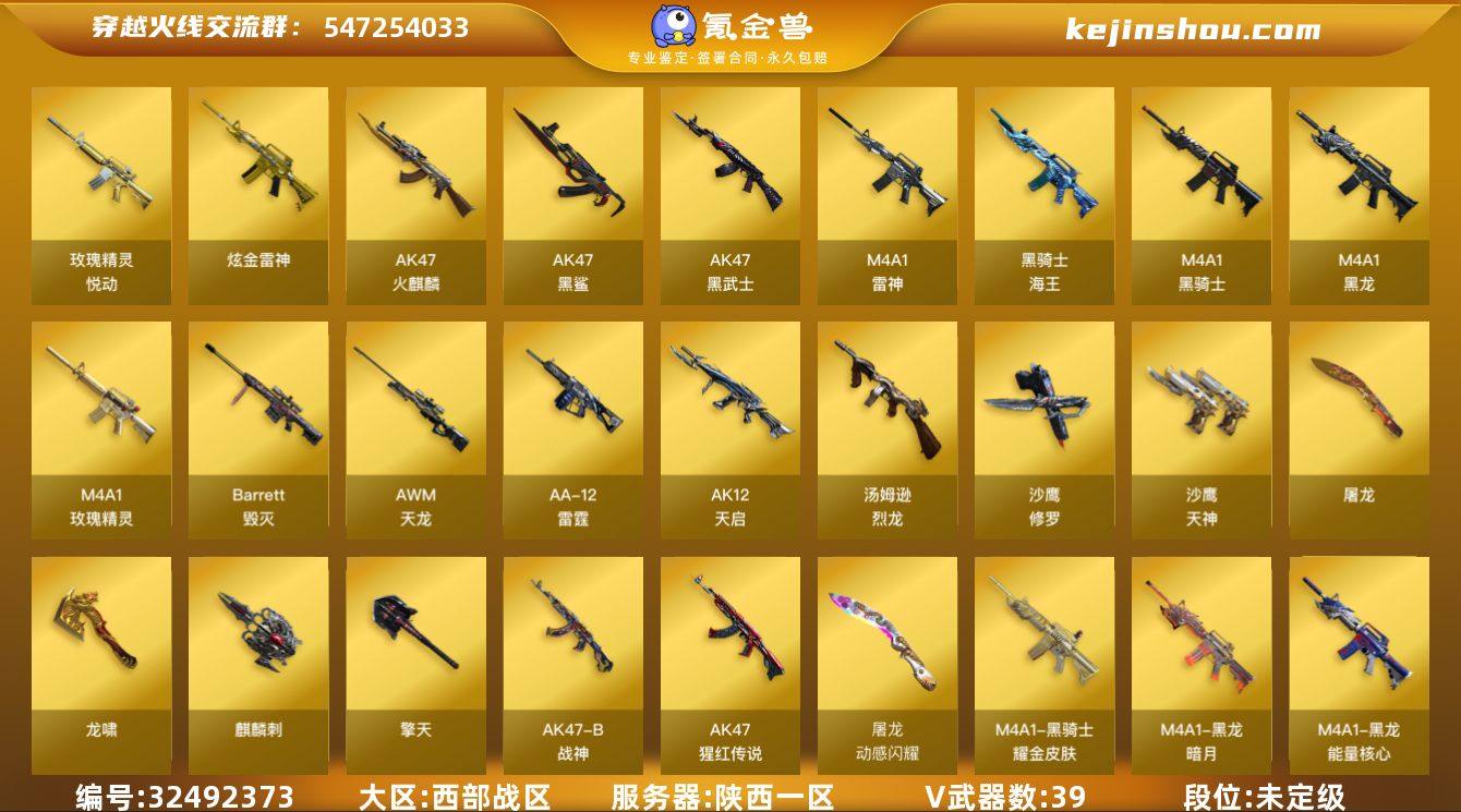 陕西一区-39V-4王者-1炫金 【热门武器】:死亡之眼,QBZ03-街机,金色小号,M4A1-黑骑士,汤姆逊-烈龙*2,加特林-炼狱,降世魔童,火麒麟-绝迹,沙鹰-修罗*4 【王者炫金武器】:玫瑰精灵-悦动,炫金雷神,王者之魄高爆手雷 【音效卡】:AK47-火麒麟音效卡,M4A1-黑骑士音效卡 【皮肤】:火麒麟-雷神,火麒麟-平天大圣,黑龙-能量核心,黑龙-暗月,黑骑士耀金皮肤,死神-秘银,战神-粉色甜心皮肤,战神-紫绶金章皮肤*3,战神-流金岁月皮肤*3,修罗-能量核心 【角色】:初恋灵狐,芳心审判者,虎妞,嘉年华灵狐,娟娟,灵狐者-X,灵狐者-黄金海岸,曼陀罗-X,潜龙队-X,邱刚敖,斯沃特-X,新娜塔莎,影武者-X 【人偶武器】:火麒麟-绝迹,AWM-灵狐-15周年嘉年华,迷你牛魔王,闪光弹-小乔,迷你艾比,迷你巨石泰坦-魔花研究所,降世魔童 【暴走生化】:死亡之眼 【英雄级武器】:AK47-火麒麟,M4A1-黑龙,M4A1-雷神*2,M4A1-黑骑士,AK47-黑武士,AK12-天启,AK47-黑鲨,M4A1-玫瑰精灵,AK-47-猩红传说*6,AK47-B-战神,黑骑士-海王*2,AWM-天龙,Barrett-毁灭,王者之怒-觉醒版,加特林-炼狱,汤姆逊-烈龙*2,AA-12-雷霆,沙鹰-修罗*4,沙鹰-天神,屠龙*2,龙啸,擎天,麒麟刺...