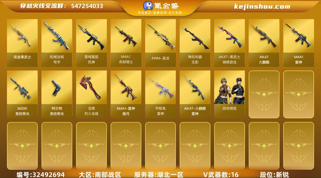 湖北一区-20V-0王者武器数-1炫金武器数 【热门武器】:M200-竞技荣光,死亡之眼 【王者炫金武器】:炫金武士 【音效卡】:死神-雪域霜狐-怀旧音效卡,AWM-昌龙-怀旧音效卡 【皮肤】:雷神-暗月,雷神-宇航兔皮肤,火麒麟-雷神 【角色】:战地猎狐,雪域霜狐,奇洋探员,乔伊教练,幻面灵狐,电竞少女,风暴女,疾风,娟娟,猎狐者-追月,0号玩家,曼陀罗-礼服,潘多拉-甜心教官,青霞仙子,蛇姬,斯沃特-X,维纳斯,新娜塔莎,雪莉杨-摸金校尉,夜玫瑰-宠粉,樱-战斗天使,影武者-X 【人偶武器】:迷你生化手雷,生化手雷-机甲核心*2,灵狐娃娃手雷 【暴走生化】:死亡之眼 【挑战大师】:神圣爆裂者-末日III 【英雄级武器】:AK47-火麒麟,M4A1-雷神,无影-神兵利器,黑武士-锦绣游龙,死神-雪域霜狐,HK417-朱雀-电竞之星,机械迷城-穹宇,M200-竞技荣光,柯尔特-竞技荣光,柯尔特-荣耀世冠EP*2,尼泊尔-雷霆,屠龙-电竞之星,龙啸-烈火龙威,闪光弹-竞技荣光,烟雾弹-竞技荣光,M4A1-赤狱骑士,AWM-昌龙 【源级武器】:源·火麒麟,魂·火麒麟-百城,火麒麟-雷神,御·黑龙-龙太子,源·雷神*2,魂·M4A1-雷神-化蛇,魂·雷神-诺拉,魂·雷神-神秘按键,魂-雷神-萌杀,御·雷神-机...