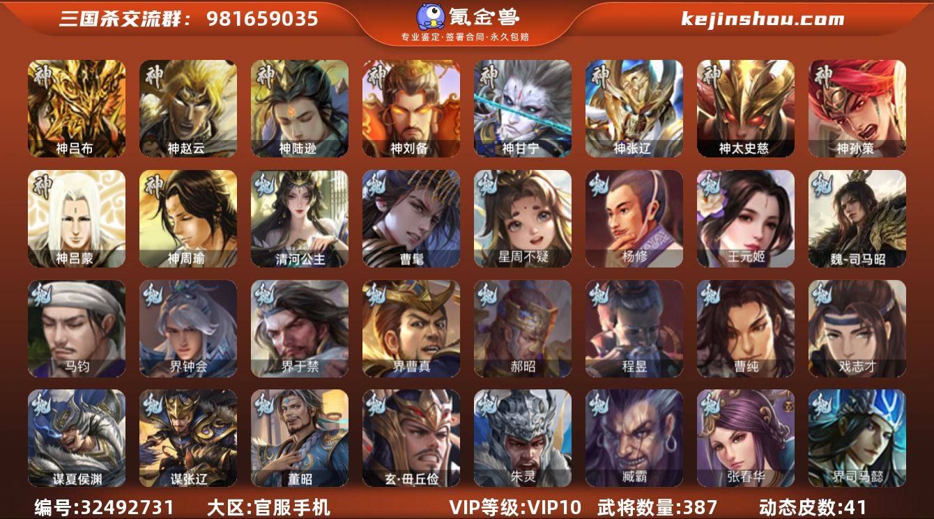 VIP等级: VIP10 官阶: 大将军 武将数量: 387 动态皮肤数量: 41 神将: 神甘宁,神刘备,神陆逊,神吕布,神孙策,神太史慈,神张辽,神赵云,神吕蒙,神周瑜 魏国武将: 戏志才,曹纯,程昱,郝昭,界曹真,界于禁,界钟会,马钧,魏-司马昭,王元姬,杨修,唐咨-魏,张辽,SP蔡文姬,SP曹仁,SP关羽,SP贾诩,SP姜维,SP庞德,卞夫人,蔡贞姬,曹昂,曹操,曹冲,曹洪,曹丕,曹仁,曹叡,王异,张恭,鲁芝,曹休,界曹植,满宠,荀攸,钟繇,郭嘉,牵招,荀彧,杜畿,界郭嘉,崔琰,界荀彧,朱灵,界甄姬,吕虔,界王异,界许褚,华歆,陈群,界典韦,李通,乐进,辛宪英,郭淮,界曹彰,郭皇后,夏侯惇,曹植,司马朗,界曹操,星周不疑,许褚,界张辽,谋徐晃,张郃,钟会,文聘,曹彰,界夏侯惇,诸葛诞,司马懿,甄姬,杨阜,徐晃,韩浩史涣,胡班,曹真,典韦,界夏侯渊,夏侯渊,李典,于禁,王双,邓艾,界司马懿,张春华,臧霸,朱灵(国战),曹髦,玄·毌丘俭,清河公主,董昭,谋张辽,谋夏侯渊 蜀国武将: 董允,关索,花鬘,界黄忠,谯周,沙摩柯,王平,赵襄,诸葛瞻,谋马超,谋赵云,谋黄忠,马云騄,谋黄月英,徐庶,界魏延,杨仪,吕凯,界关羽,界诸葛亮,邓芝,界伊籍,胡金定,严颜,界黄月英,界张嶷,赵云,张松,彭羕,李丰,界刘备,谋法正,谋姜维,刘封,糜竺,谋庞统,黄月英,刘巴,关羽,吴懿,界吴懿,...