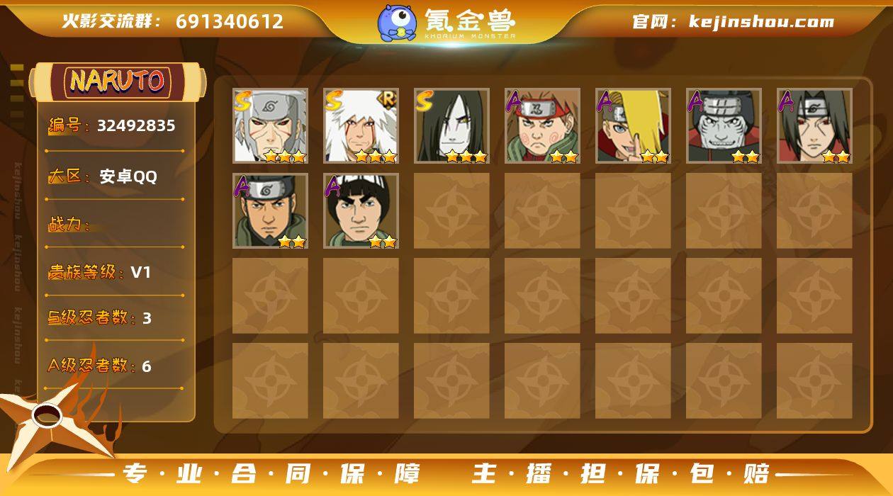 3S级忍者数-6A级忍者数 【S级忍者】:千手扉间「秽土转生」(3星),自来也「舞之豪杰」(3星),大蛇丸(3星) 【A级忍者】:迪达拉(2星),干柿鬼鲛(2星),迈特凯(2星),猿飞阿斯玛(2星),宇智波鼬(2星),秋道丁次「忍界大战」(2星)